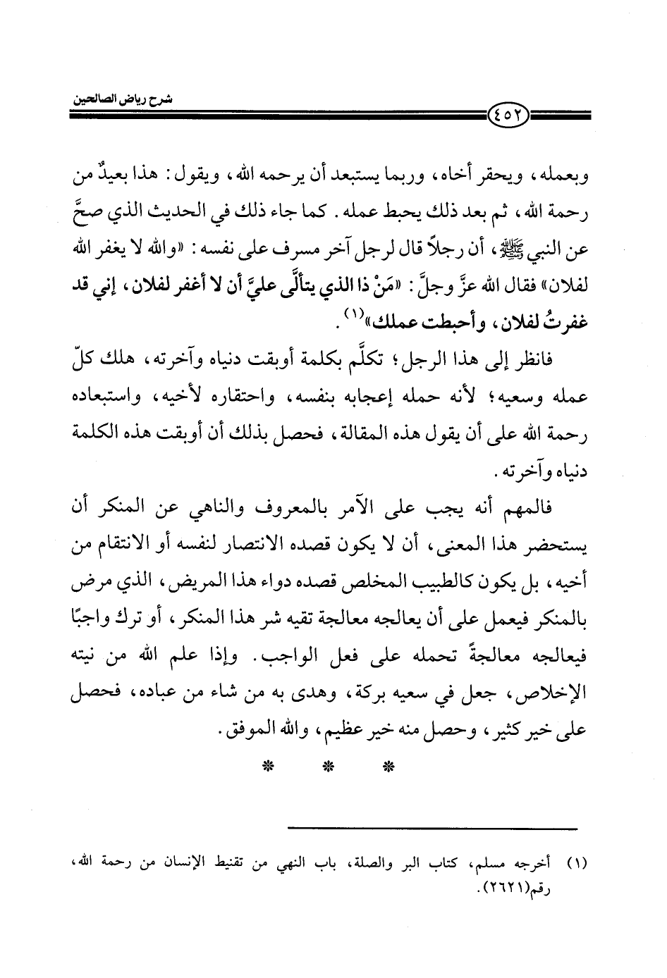 وبعمله، ويحقر أخاه، وربما يستبعد أن يرحمه الله، ويقول: هذا بعيدٌ من رحمة الله، ثم ذلك يحبط عمله. كما جاء ذلك في الحديث الذي صحّ عن النبي صلى الله عليه وسلم، أن رجلاً قال لرجل آخر مسرف على نفسه: " والله لا يغفر الله لفلان" فقال الله عزّ وجلّ: " من ذا الذي يتألّى عليّ أن لا أغفر لفلان، إني قد غفرتُ له، وأحبطت عملك.