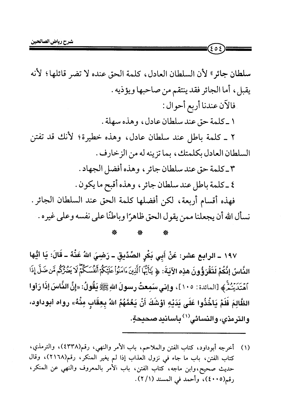 197- الرابع عشر:: عن أبي بكر الصديق - رضي الله عنهُ- قال: يا أيها الناسُ أنكم لتقرؤون هذه الآية: (يَا أَيُّهَا الَّذِينَ آمَنُوا عَلَيْكُمْ أَنْفُسَكُمْ لا يَضُرُّكُمْ مَنْ ضَلَّ إِذَا اهْتَدَيْتُمَْ) (المائدة: 105) ، وإني سمعت رسول الله صلى الله عليه وسلم يقول: " إن الناس إذا رأوا الظالم فلم يأخذوا على يديه أوشك أن يعمهم الله بعقاب منه" رواه أبو داود والترمذي، والنسائي بأسانيد صحيحة.