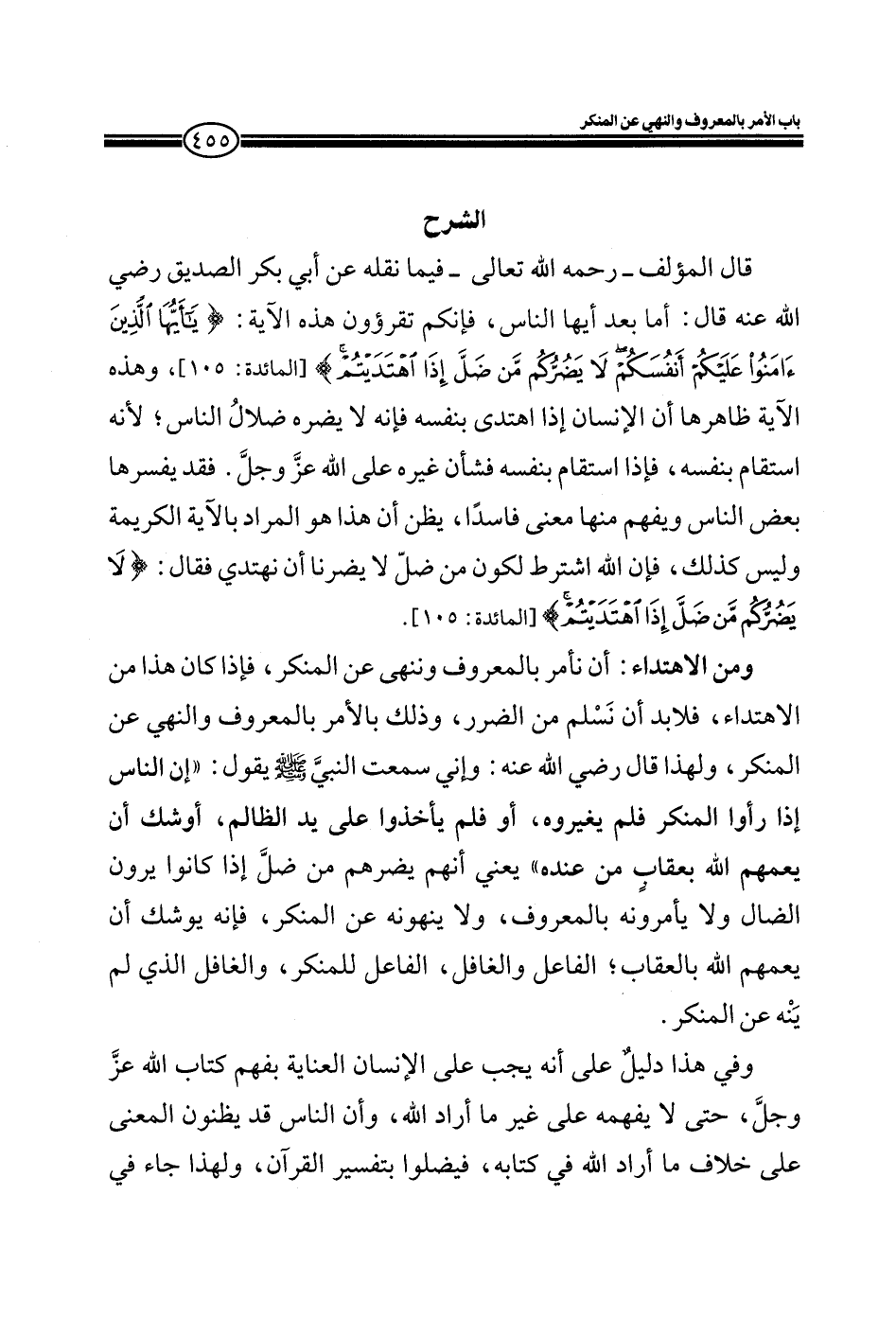 EXقال المؤلف رحمه الله تعالى-فيما نقله عن أبي بكر الصديق رضي الله عنه قال: إما بعد أيها الناس، فإنكم تقرؤون هذه الآية (يَا أَيُّهَا الَّذِينَ آمَنُوا عَلَيْكُمْ أَنْفُسَكُمْ لا يَضُرُّكُمْ مَنْ ضَلَّ إِذَا اهْتَدَيْتُمَْ) (المائدة: 105) ، وهذه الآية ظاهرها أن الإنسان إذا اهتدى بنفسه فإنه لا يضره ضلالُ الناس؛ لأنه استقام بنفسه، فإذا استقام بنفسه فشأن غيره على الله عزّ وجلّ. فقد يفسرها بعض الناس ويفهم منها معنى فاسداً، يظن أن هذا هو المراد بالآية الكريمة وليس كذلك، فإن الله اشترط لكون من ضلّ لا يضرنا أن نهتدي فقال: (لا يَضُرُّكُمْ مَنْ ضَلَّ إِذَا اهْتَدَيْتُمَْ) .