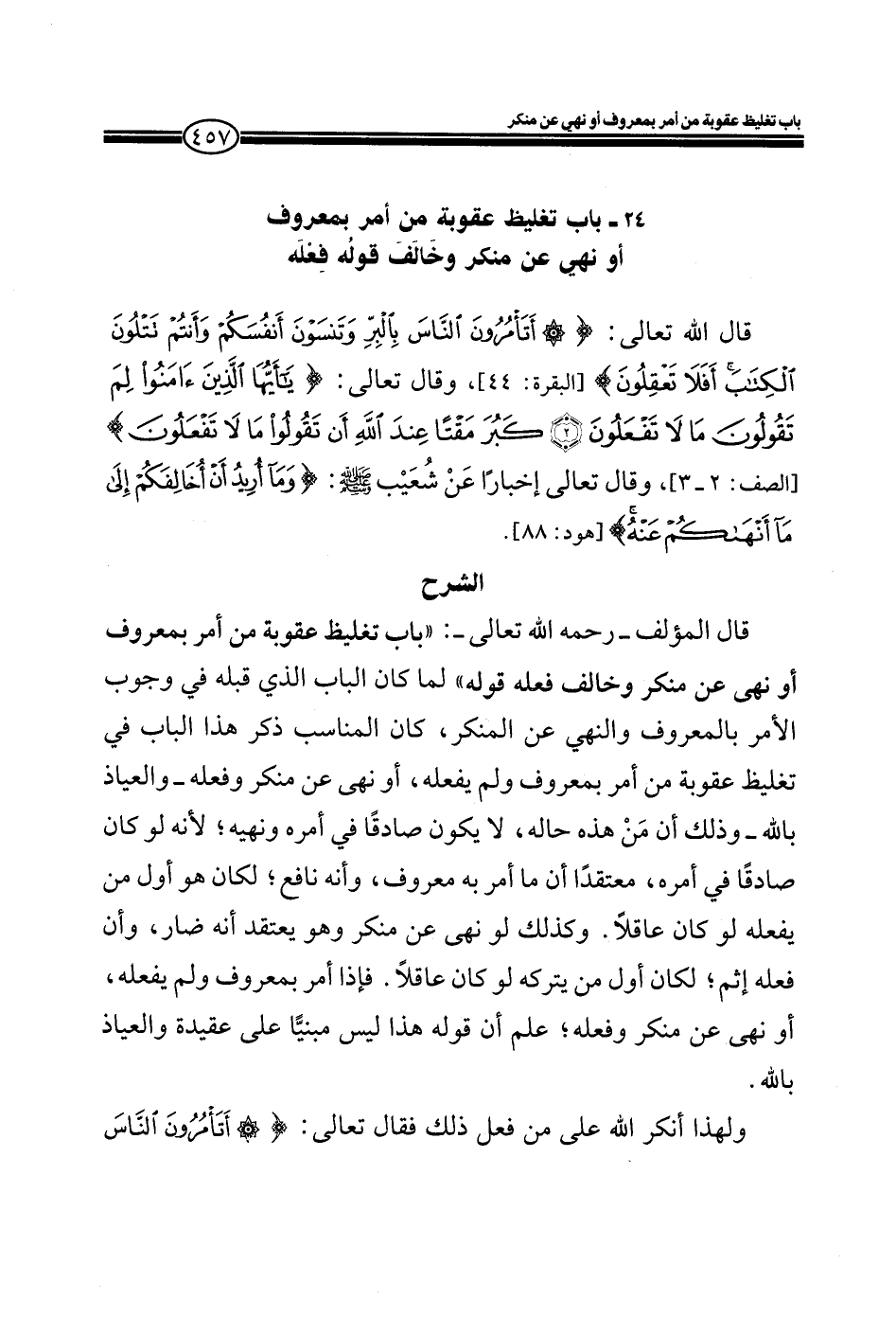 EXقال المؤلف رحمه الله تعالى-: باب تغليظ عقوبة من أمر بمعروف أو نهى عن منكر وخالف فعله قوله" لما كان الباب الذي قبله في وجوب الأمر بالمعروف والنهي عن المنكر، كان المناسب ذكر هذا الباب في تغليظ عقوبة من أمر بمعروف ولم يفعله، أو نهى عن منكر وفعله - والعياذ بالله - وذلك أن من هذه حالة، لا يكون صادقاً في أمره ونهيه؛ لأنه لو كان صادقاً في أمره، معتقداً أن ما أمر به معروف، وأنه نافع؛ لكان هو أول من يفعله لو كان عاقلاً. وكذلك لو نهى عن منكر وهو يعتقد أنه ضار، وأن فعله إثم؛ لكان أول من يتركه لو كان عاقلاً. فإذا أمر بمعروف ولم يفعله، أو نهى عن منكر وفعله؛ علم أن قوله هذا ليس مبنياً على عقيدة والعياذ بالله.