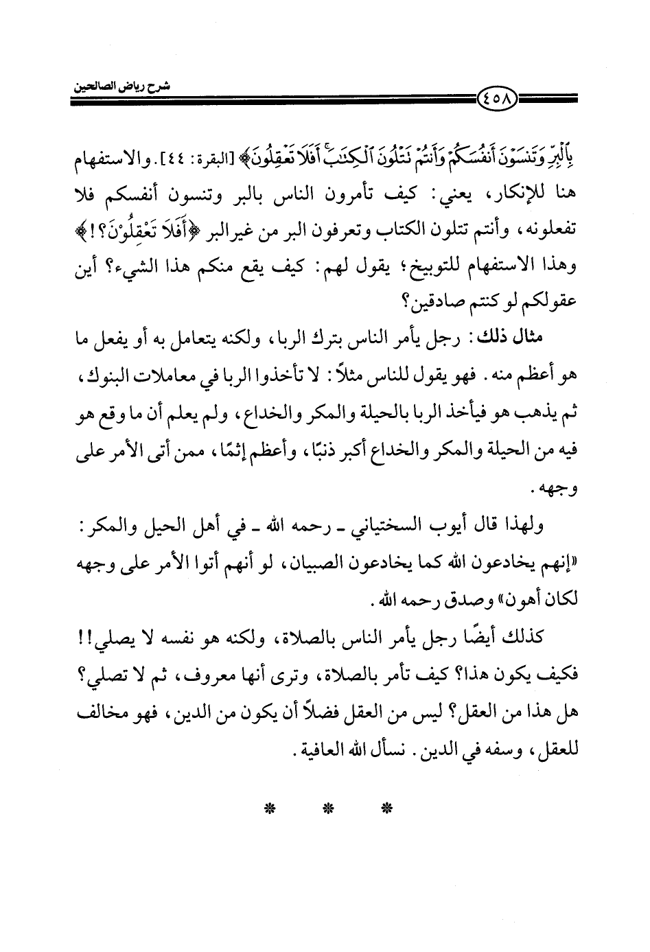 بِالْبِرِّ وَتَنْسَوْنَ أَنْفُسَكُمْ وَأَنْتُمْ تَتْلُونَ الْكِتَابَ أَفَلا تَعْقِلُونَ) (البقرة: 44) والاستفهام هنا للإنكار، يعني: كيف تأمرون الناس بالبر وتنسون أنفسكم فلا تفعلونه، وأنتم تتلون الكتاب وتعرفون البر من غير البر (أَفَلا تَعْقِلُونَ؟) هذا الاستفهام للتوبيخ؛ يقول لهم: كيف يقع منكم هذا الشيء؟ أين عقولكم لو كنتم صادقين؟