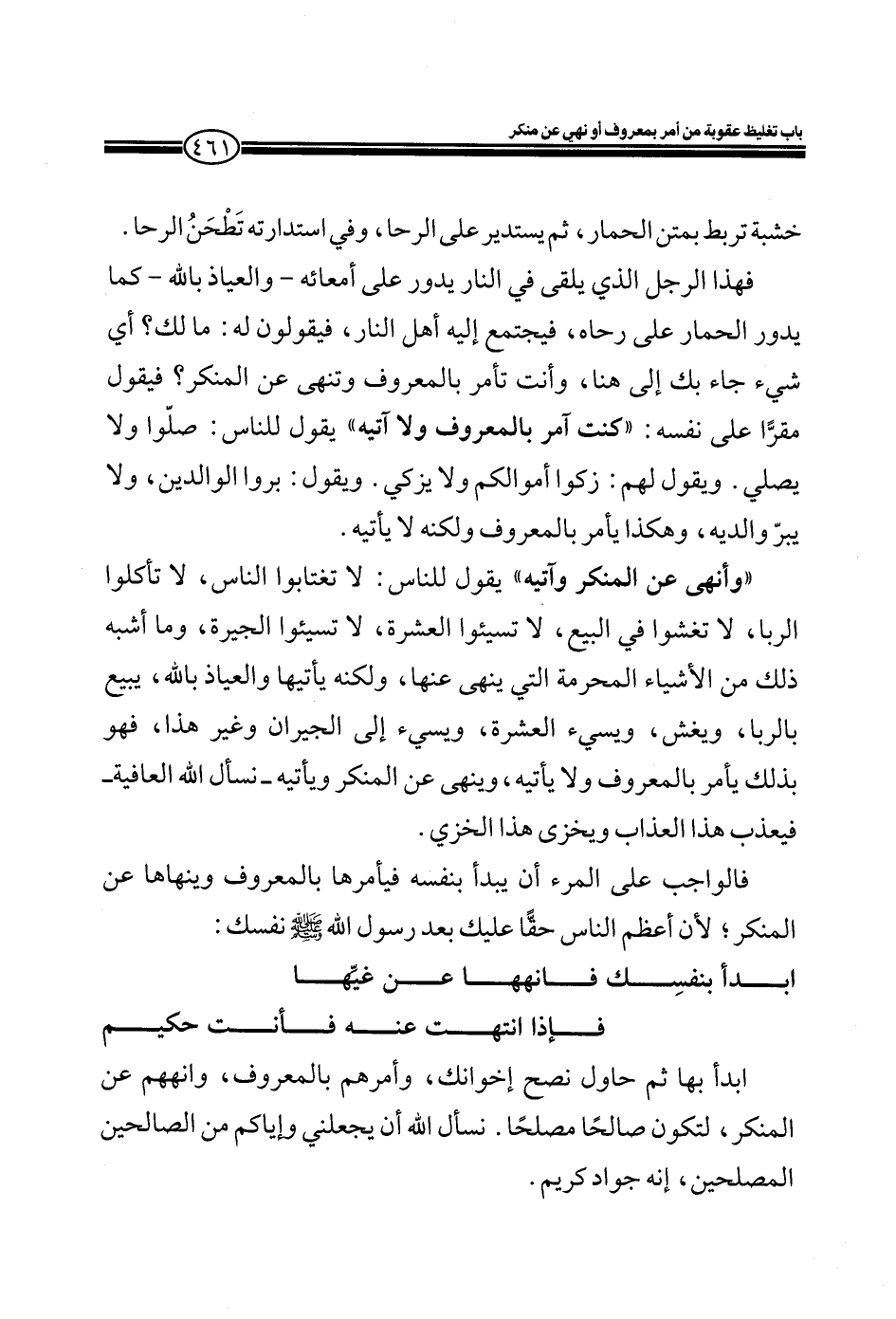 فهذا الرجل الذي يلقى في النار يدور على أمعائه- والعياذ بالله - كما يدور الحمار على رجاه، فيجتمع إليه أهل النار، فيقولون له: ما لك؟ أي شيء جاء بك إلى هنا، وأنت تأمر بالمعروف وتنهى عن المنكر؟ فيقول مقراً على نفسه: " كنت آمر بالمعروف ولا آتيه" يقول للناس " صلوا ولا يصلي. ويقول لهم: زكوا أموالكم ولا يزكى. ويقول: بروا الوالدين، ولا يبر والديه، وهكذا يأمر بالمعروف ولكنه لا يأتيه.