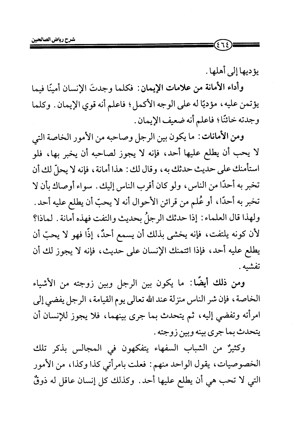 ومن الأمانات: ما يكون بين الرجل وصاحبه من الأمور الخاصة التي لا يحب أن يطلع عليها أحد، فإنه لا يجوز لصاحبه أن يخبر بها، فلو استأمنك على حديث حدثك به، وقال لك: هذا أمانة، فإنه لا يحلّ لك أن تخبر به أحداً من الناس، ولو كان أقرب الناس إليك. سواء أوصاك بأن لا تخبر به أحداً، أو عُلم من قرائن الأحوال أنه لا يحب أن يطلع عليه أحد. ولهذا قال العلماء: إذا حدثك الرجل بحديث والتفت فهذه أمانة، لماذا؟ لأنه كونه يلتفت، فإنه يخشى بذلك أن يسمع أحدٌ، إذاً فهو لا يحب أن يطلع عليه أحد، فإذا ائتمنك الإنسان على حديث، فإنه لا يجوز لك أن تفشيه.