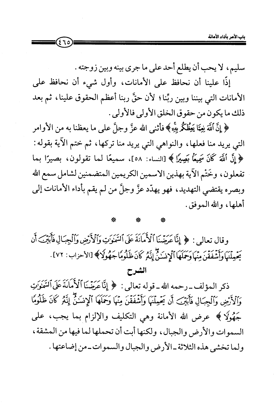 EXذكر المؤلف- رحمه الله - قوله تعالى:: (إِنَّا عَرَضْنَا الْأَمَانَةَ عَلَى السَّمَاوَاتِ وَالْأَرْضِ وَالْجِبَالِ فَأَبَيْنَ أَنْ يَحْمِلْنَهَا وَأَشْفَقْنَ مِنْهَا وَحَمَلَهَا الْأِنْسَانُ إِنَّهُ كَانَ ظَلُوماً جَهُولاً) عرض الله الأمانة وهي التكليف والإلزام بما يجب، على السموات والأرض والجبال، ولكنها أبت أن تحملها لما فيها من المشقة، ولما تخشى هذه الثلاثة - الأرض والجبال والسموات - من إضاعتها.