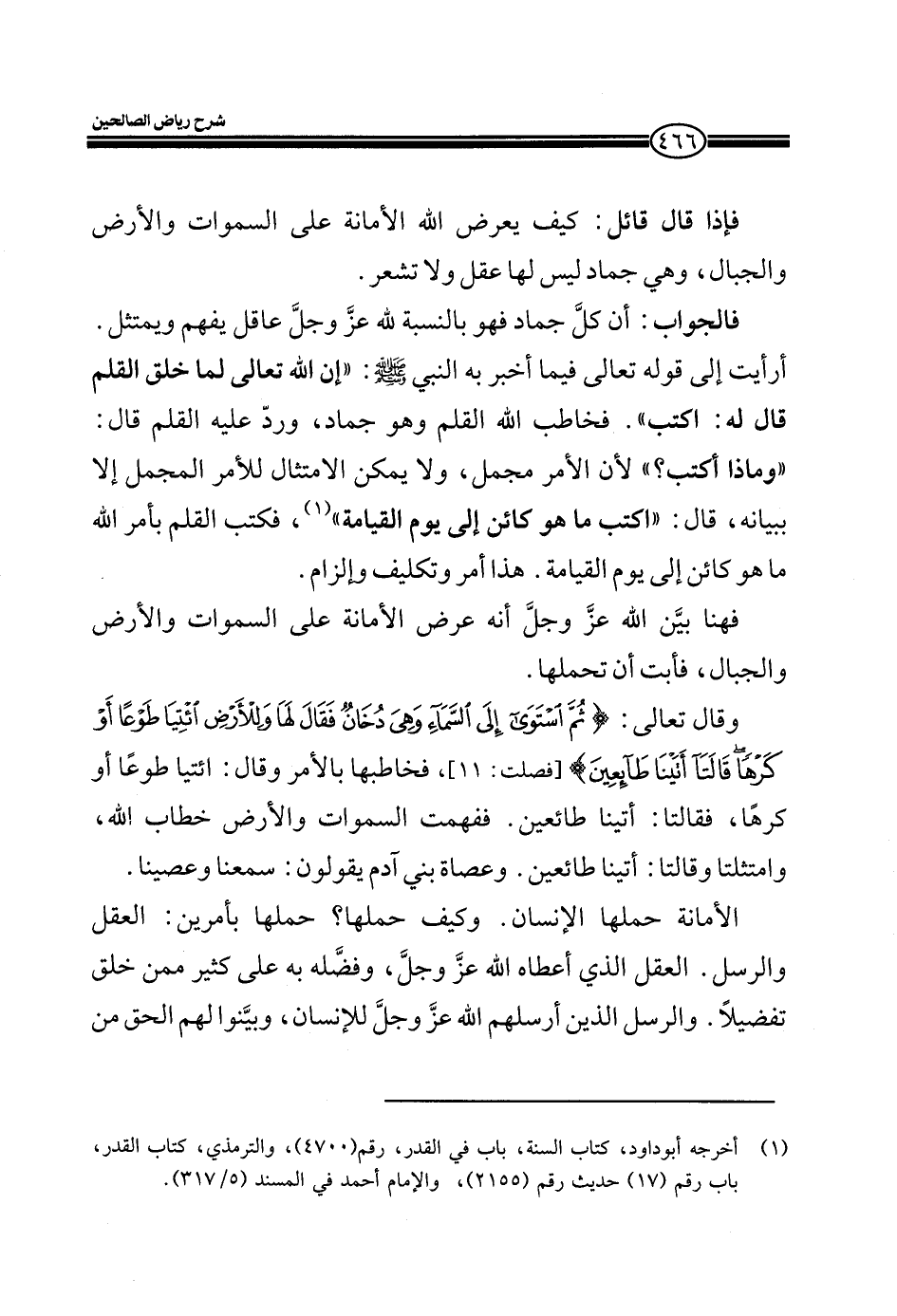 فالجواب: أن كلّ جماد فهو بالنسبة لله عزّ وجلّ عاقل يفهم ويمتثل. أرأيت إلى قوله تعالى فيما أخبر به النبي صلى الله عليه وسلم: " إن الله تعالى لما خلق القلم قال له " اكتب". فخاطب الله القلم وهو جماد، وردّ عليه القلم قال: " وماذا اكتب؟ " لأن الأمر مجمل، ولا يمكن الامتثال للأمر المجمل إلا ببيانه، قال " اكتب ما هو كائن إلى يوم القيامة" فكتب القلب بأمر الله ما هو كائن إلى يوم القيامة. هذا أمر وتكليف وإلزام.