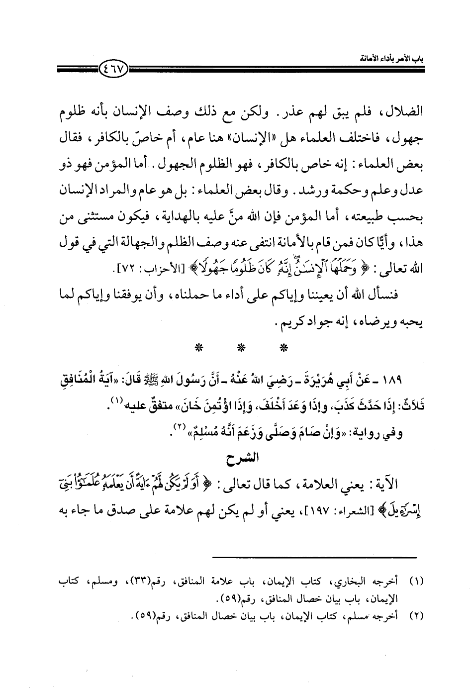 189- عن أبي هريرة- رضي الله عنه- أن رسول الله صلى الله عليه وسمل قال: " آية المنافق ثلاث: إذا حدث كذب، وإذا وعد أخلف، وإذا اؤتمن خان" متفقٌ عليه.