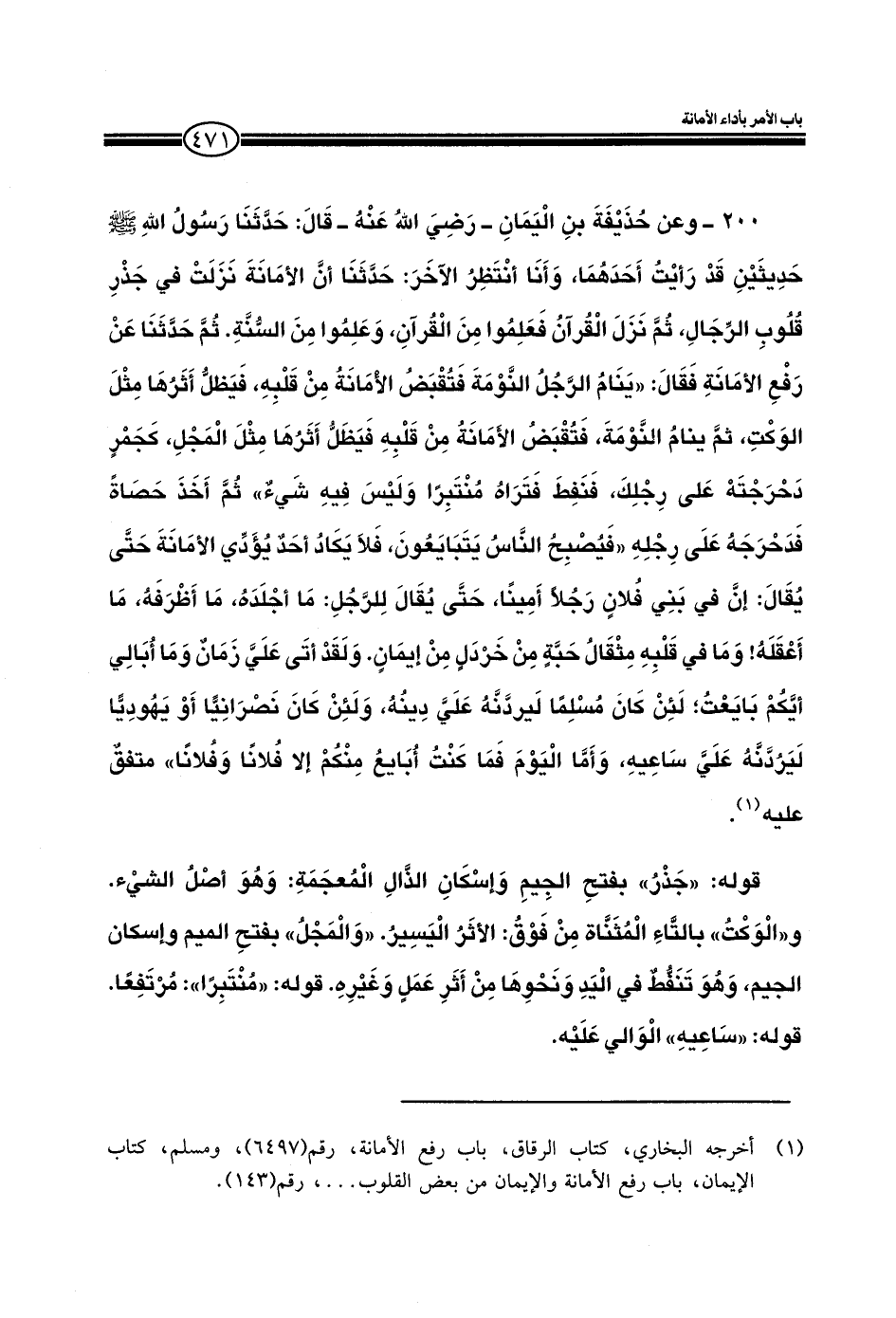200-وعن حذيفة بن اليمان- رضي الله عنه- قال: حدثنا رسول الله صلى الله عليه وسلم حديثين قد رأيت أحدهما، وأنا انتظر الآخر: حدثنا أن الأمانة نزلت في جذر قلوب الرجال، ثم نزل القرآن فعملوا من القرآن، وعلموا من السنة، ثم حدثنا عن رفع الأمانة فقال: " ينام الرجل النومة فتقبض الأمانةُ من قلبه، فيظل أثرها مثل الوكت، ثم ينام النومةً، فتقبض الأمانةُ من قلبهِ فيظلُ أثرها مثل المجلِ، كجمر دحرجته على رجلك، فنفط فتراهُ منتبرا وليس فيه شيءُ" ثم أخذ حصاة فدحرجه على رجلهِ" فيصبح الناسُ يتبايعون، فلا يكادُ أحدٌ يؤدي الأمانة حتى يقالَ: إن في بني فُلانٍ رجُلاً أميناً، حتى يقال للرجل: ما أجلده، ما أظرفه، ما أعقله! وما في قلبه مثقال حبةٍ من خردلٍ من إيمانٍ، ولقد أتى علي زمانٌ وما أُبالي أيكم بايعتُ: لئن كان مسلماً ليردنه على دينهُ، ولئن كان نصرانياً أو يهودياً ليردنه على ساعيه، وأما اليوم فما كنتُ أُبايع منك إلا فُلاناً وفُلاناً " متفق عليه.
