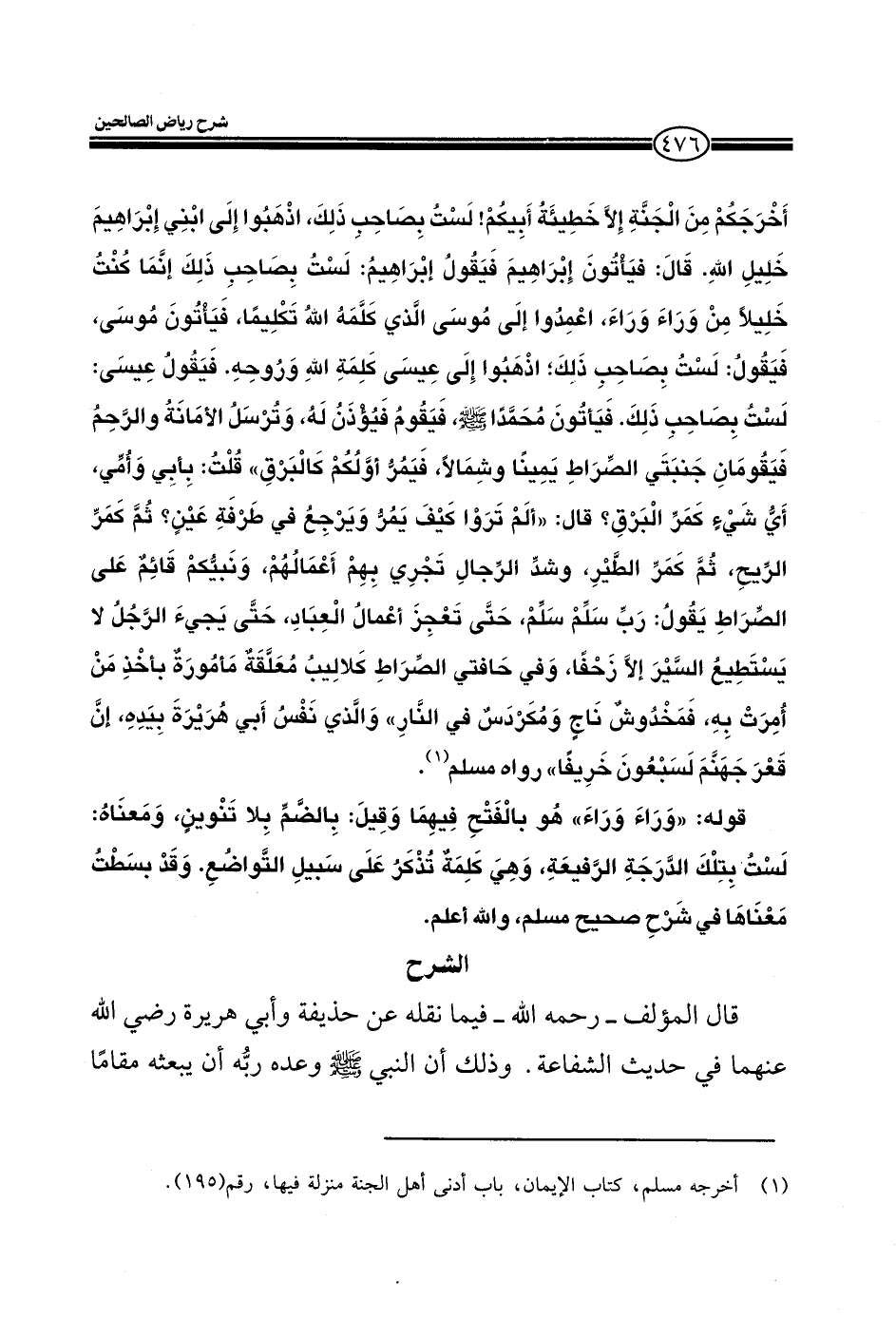 أخرجكم من الجنة إلا خطيئةُ أبيكم! لست بصاحب ذلك، اذهبوا إلى إبني إبراهيم خليل الله، قال: فيأتون إبراهيم فيقول إبراهيم: لست بصاحب ذلك إنما كنت خليلاً من وراء وراء، اعمدوا إلى موسى الذي كلمه الله تكليما، فيأتون موسى فيقول: لست بصاحب ذلك؛ اذهبوا إلى عيسى كلمة الله وروحه، فيقول عيسى: لست بصاحب ذلك، فيأتون محمداً صلى الله عليه وسلم، فيقوم فيؤذن له، وترسل الأمانةُ والرحم فيقومان جنبتي الصراط يميناً وشمالاً، فيمر أولكم كالبرقِ" قلتُ: بأبي وأمي، أي شيءٍ كمر البرقِ؟ قال: " ألم تروا كيف يمرُ ويرجعُ في طرفة عين؟ ثم كمر الريح ثم كمر الطيرِ، وشد الرجال تجري بهم أعمالهم، ونبيكم قائماٌ على الصراط يقول: رب سلم سلم، حتى تعجز أعمالُ العبادِ حتى يجيء الرجلُ لا يستطيع السير إلا زحفا، وفي حافتي الصراط كلاليبُ معلقةٌ مأمورةٌ بأخذ من أمرت به، فمخدوشٌ ناجٍ ونكردسٌ في النار" والذي