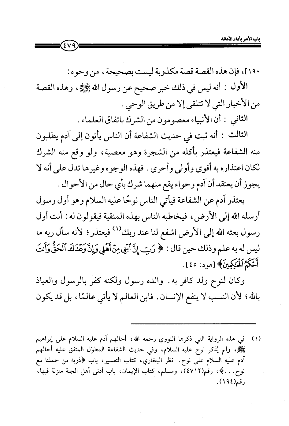 الثالث: أنه ثبت في حديث الشفاعة أن الناس يأتون إلى آدم يطلبون منه الشفاعة فيعتذر بأكله من الشجرة وهو معصية، ولو وقع منه الشرك لكان اعتذاره به أقوى وأولى وأحرى. فهذه الوجوه وغيرها تدل على أنه لا يجوز أن يعتقد أن آدم وحواء يقع منهما شرك بأي حال من الأحوال.