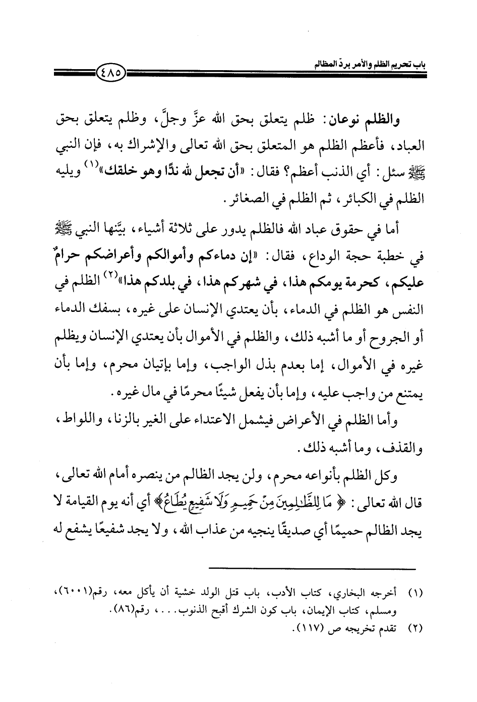 أما في حقوق عباد الله فالظلم يدور على ثلاثة أشياء، بينها النبي صلى الله عليه وسلم في خطبة حجة الوداع، فقال: " إن دماءكم وأموالكم وأعراضكم حرام عليكم، كحرمة يومكم هذا، في شهركم هذا، في بلدكم هذا" الظلم في النفس هو الظلم في الدماء، بأن يعتدي الإنسان على غيره، بسفك الدماء أو الجروح أو ما أشبه ذلك، والظلم في الأموال بأن يعتدي الإنسان ويظلم غيره في الأموال، إما بعدم بذل الواجب، وإما بإتيان محرم، وإما بان يمتنع من واجب عليه، وإما بأن يفعل شيئاً محرماً في مال غيره.