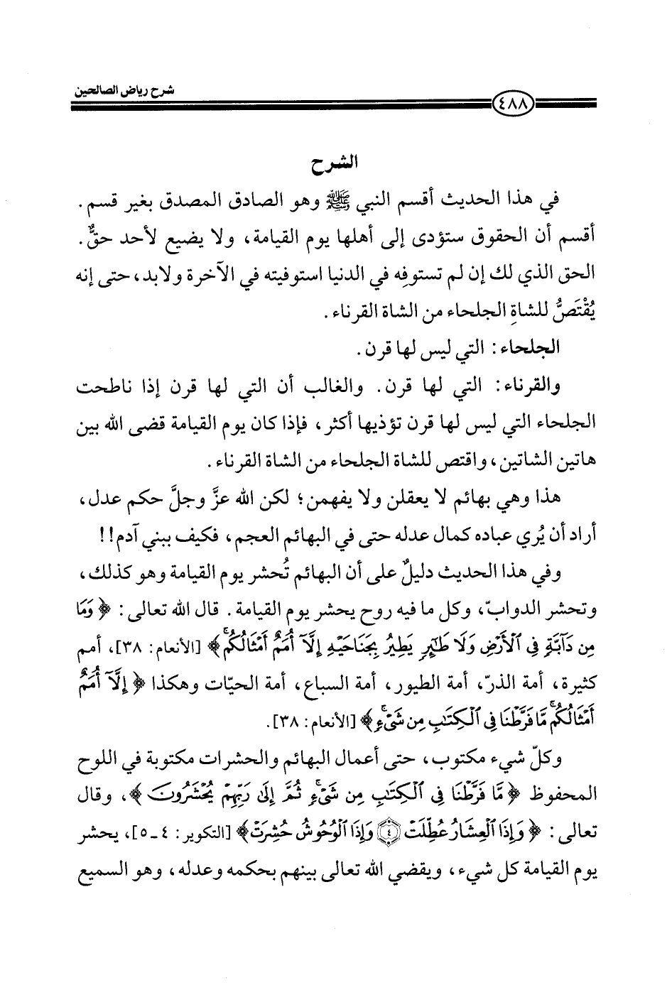 وفي هذا الحديث دليلٌ على أن البهائم تُحشر يوم القيامة وهو كذلك، وتحشر الدوابّ، وكل ما فيه روح يحشر يوم القيامة، قال الله تعالى (وَمَا مِنْ دَابَّةٍ فِي الْأَرْضِ وَلا طَائِرٍ يَطِيرُ بِجَنَاحَيْهِ إِلَّا أُمَمٌ أَمْثَالُكُم) (الأنعام: 38) ، أمم كثيرة، أمة الذر، أمة الطيور، أمة السباع، أمة الحيّات وهكذا (إِلَّا أُمَمٌ أَمْثَالُكُمْ مَا فَرَّطْنَا فِي الْكِتَابِ مِنْ شَيْءٍ) (الأنعام: 38) .