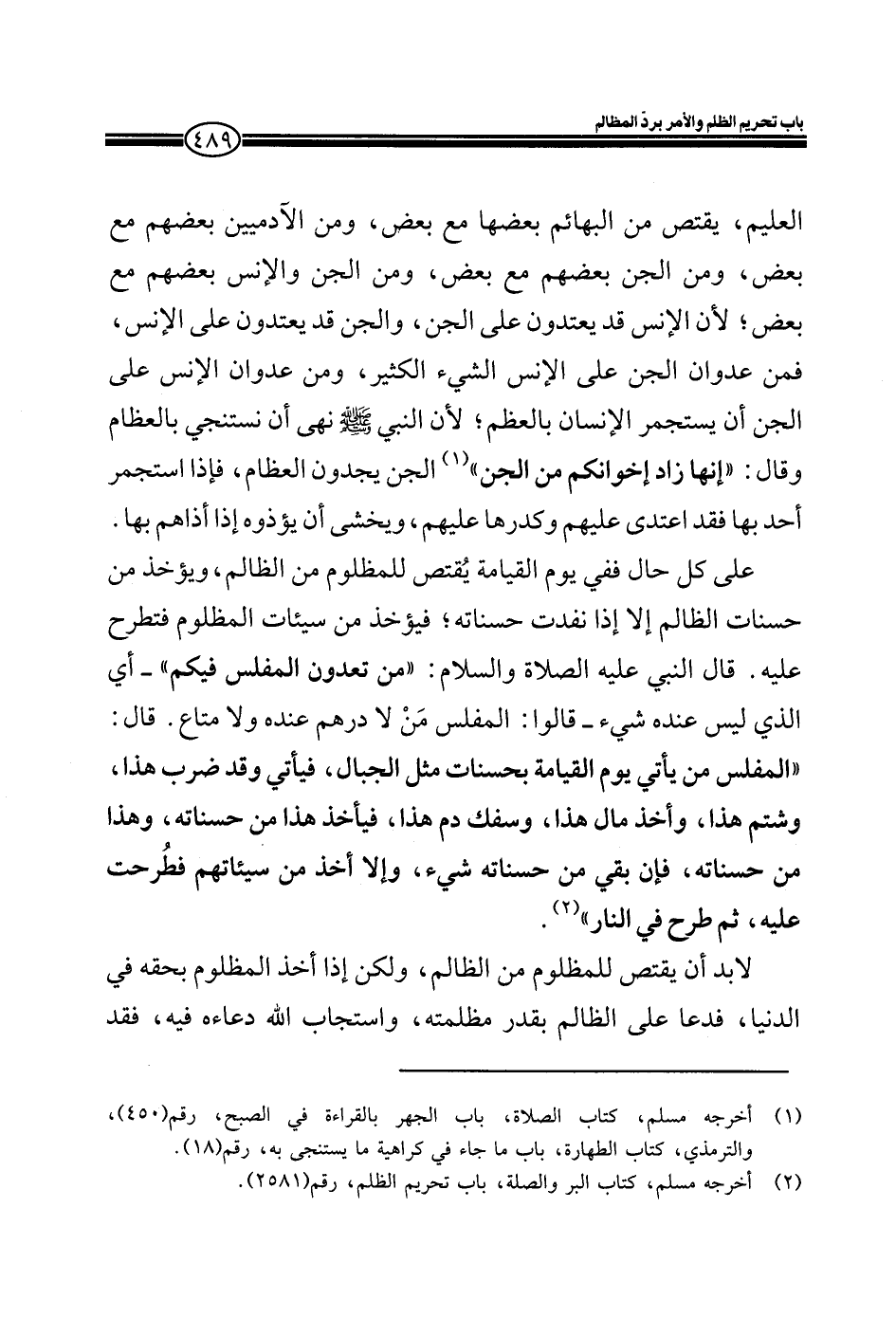 العليم، يقتص من البهائم بعضها مع بعض، ومن الآدميين بعضهم مع بعض، ومن الجن بعضهم مع بعض، ومن الجن والإنس بعضهم مع بعض، لأن الإنس قد يعتدون على الجن، والجن قد يعتدون على الإنس، فمن عدوان الجن على الإنس الشيء الكثير، من عدوان الإنس على الجن أن يستجمر الإنسان بالعظم؛ لأن النبي صلى الله عليه وسلم نهى أن نستنجي بالعظام وقال: " إنها زاد إخوانكم من الجن " الجن يجدون العظام، فإذا استجمر أحد بها فقد اعتدى عليهم وكدرها عليهم، ويخشى أن يؤذوه إذا أذاهم بها.