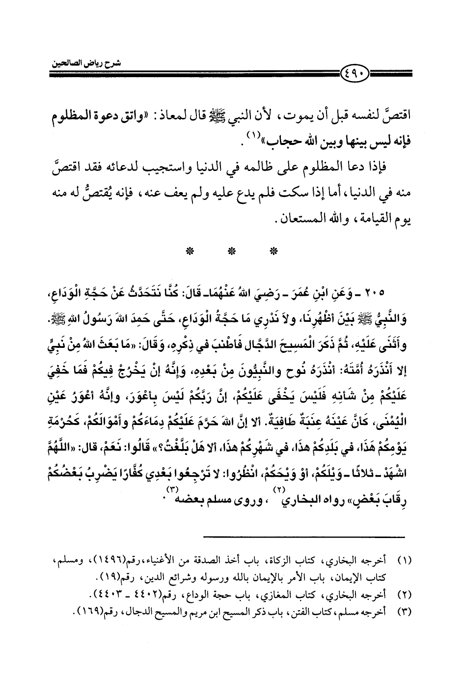 205- وعن ابن عمر- رضي الله عنهما- قال: كنا نتحدث عن حجة الوداع، والنبي صلى الله عليه وسلم بين أظهرنا، ولا ندري ما حجةُ الوداع، حتى حمد الله رسول الله صلى الله عليه وسلم، وأثني عليه، ثم ذكر المسيح الدجال فأطنب في ذكره، وقال: " ما بعث الله من نبي إلا أنذره أمتهُ: أنذرهُ نوح والنبيون من بعده، وإنه إن يخرج فيكم فما خفي عليكم من شأنه فليس يخفى عليكم، إن ربكم ليس بأعور، وإنه أعور عين اليمنى، كان عينه عنبةٌ طافيةٌ. ألا إن الله حرم عليكم دماءكم وأموالكم، كحرمة يومكم هذا، في بلدكم هذا، في شهركم هذا، إلا هل بلغت؟ " قالوا: نعم، قال: " اللهم أشهد - ثلاثاً - ويلكم، أو ويحكم، انظروا: لا ترجعُوا: بعدي كفاراً يضربُ بعضكم رقاب بعضٍ" رواه البخاري. وروى مسلم بعضه.