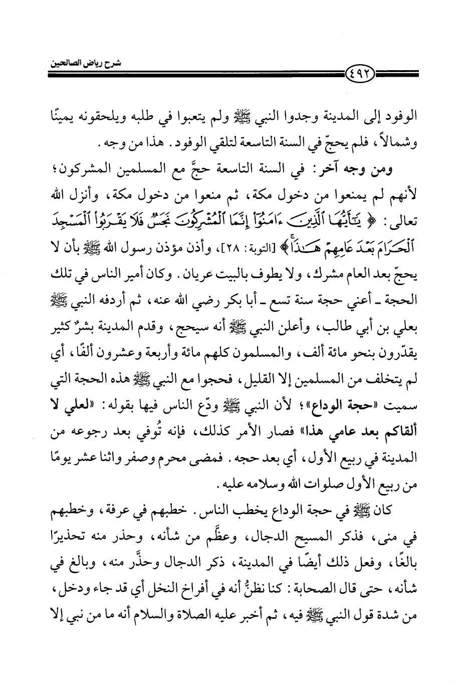 ومن وجه آخر: في السنة التاسعة حجَّ مع المسلمين المشركون؛ لأنهم لم يمنعوا من دخول مكة، ثم منعوا من دخول مكة، وانزل الله تعالى: (يَا أَيُّهَا الَّذِينَ آمَنُوا إِنَّمَا الْمُشْرِكُونَ نَجَسٌ فَلا يَقْرَبُوا الْمَسْجِدَ الْحَرَامَ بَعْدَ عَامِهِمْ هَذَا) (التوبة: 28) ، وأذن مؤذن رسول الله صلى الله عليه وسلم بأن لا يحج بعد العام مشرك، ولا يطوف بالبيت عريان. وكان أمير الناس في تكل الحجة- أعني حجة سنة تسع- أبا بكر رضي الله عنه- ثم أردفه النبي صلى الله عليه وسلم بعلي بن أبي طالب، وأعلن النبي صلى الله عليه وسلم أنه سيحج، وقدم المدينة بشرٌ كثير يقدّرون بنحو مائة ألف، والمسلمون كلهم مائه وأربعة وعشرون ألفاً، أي لم يتخلف عن المسلمين إلا القليل، فحجوا مع النبي صلى الله عليه وسلم هذه الحجة التي سميت" حجة الوداع"؛ لأن النبي صلى الله عليه وسلم ودّع الناس فيها بقوله: " لعلي لا ألقاكم بعد عامي هذا" فصار الأمر كذلك، فإنه تُوفي بعد رجوعه من المدينة في ربيع الأول، أي بعد حجه. فمضي محرم وصفر وأثنا عشر يوماً من ربيع الأول صلوات الله وسلامه عليه.