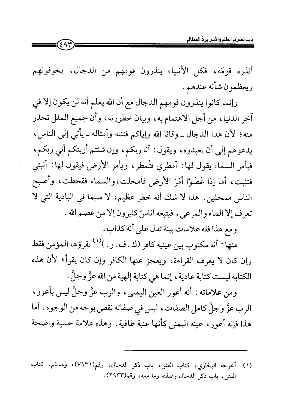 وإنما كانوا ينذرون قومهم الدجال مع أن الله يعلم أنه لن يكون إلا في آخر الدنيا، من أجل الاهتمام به، وبيان خطورته، وأن جميع الملل تحذر منه، لأن هذا الدجال- وقانا الله وإياكم فتنته وأمثاله- يأتي إلى الناس، يدعوهم إلى أن يعبدوه، ويقول: أنا ربكم، وإن شئتم أريتكم أني ربكم، فيأمر السماء يقول لها: أمطري فتُمطر، ويأمر الأرض فيقول لها: أنبتي فتنبت، أما إذا عصوا أمر الأرض فأمحلت، والسماء فقحطت، وأصبح الناس ممحلين. هذا لا شك أنه خطر عظيم، لاسيما في البادية التي لا يتعرف إلا الماء والمرعى، فيتبعه أناسٌ كثيرون إى من عصم الله.