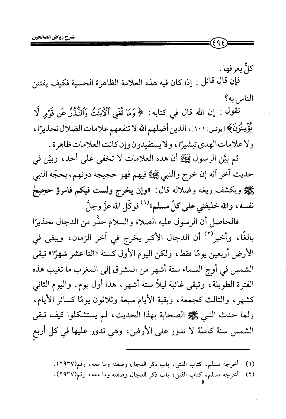 ثم بين الرسول صلى الله عليه وسلم أن هذه العلامات لا تخفى على أحد، وبين في حديث آخر أنه إن خرج والنبي صلى الله عليه وسلم فيهم فهو حجيجه دونهم، يحجه النبي صلى الله عليه وسلم ويكشف زيغه وضلاله قال: " وإن يخرج ولست فيكم فامرؤ حجيجُ نفسه، والله خليفتي على كلّ مسلم " فوكّل الله عزّ وجلّ.