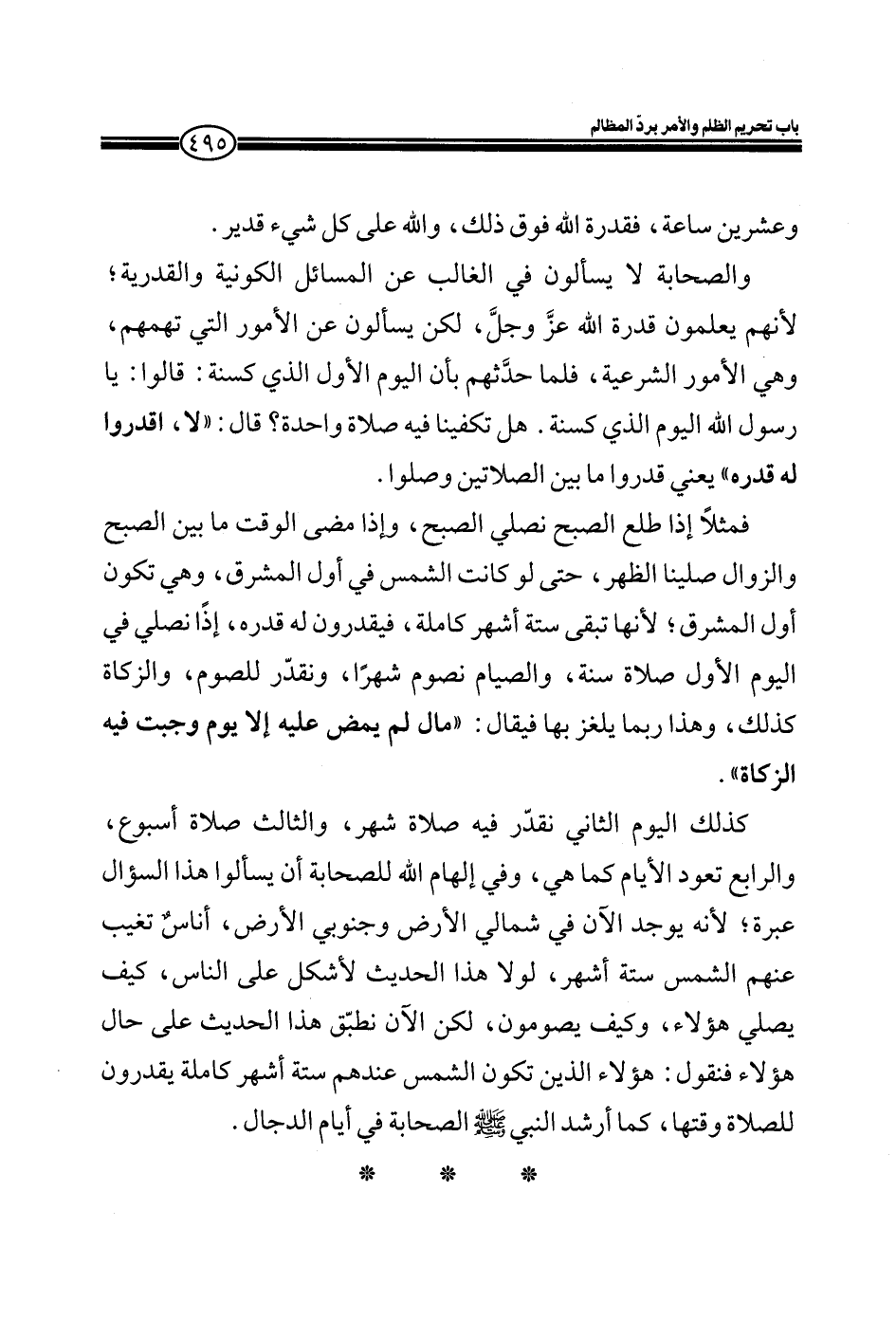 كذلك اليوم الثاني نقدّر فيه صلاة شهر، والثالث صلاة أسبوع، والرابع تعود الأيام كما هي، وفي إلهام الله للصحابة أن يسألوا هذا السؤال عبرة؛ لأنه يوجد الآن في شمالي الأرض وجنوبي الأرض، أناسٌ تغيب عنهم الشمس ستة أشهر، لولا هذا الحديث لأشكل على الناس، كيف يصلي هؤلاء، وكيف يصومون، لكن الآن نطبّق هذا الحديث على حال هؤلاء فنقول: هؤلاء الذين تكون الشمس عندهم ستة أشهر كاملة يقدرون للصلاة وقتها، كما أرشد النبي صلى الله عليه وسلم الصحابة في أيام الدجال.
