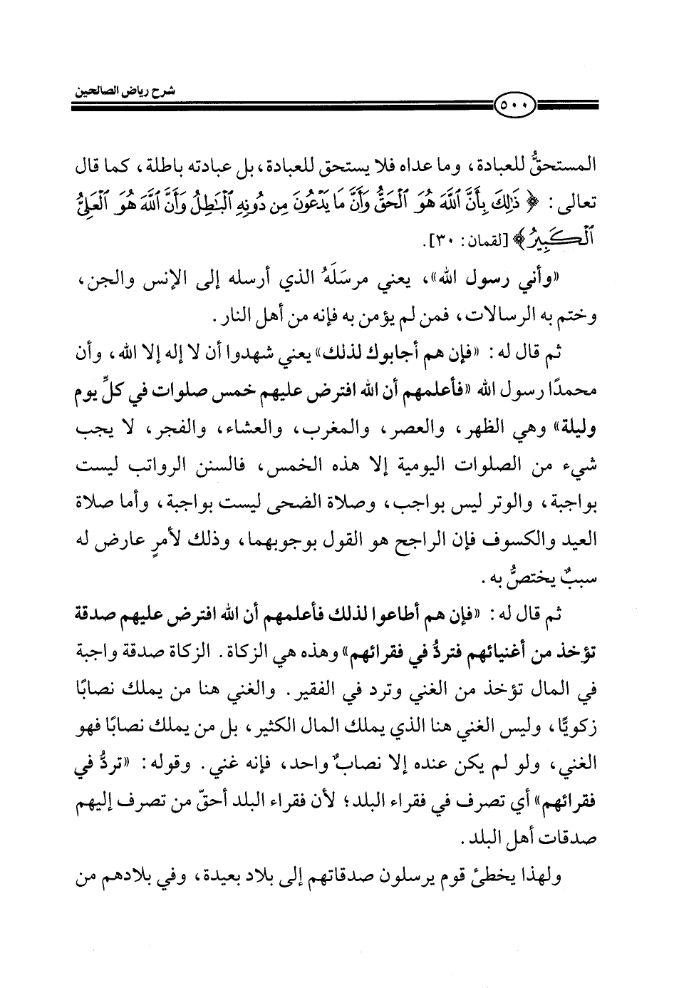 ثم قال له: " فن هم أطاعوا لذلك فأعلمهم أن الله افترض عليهم صدقة تؤخذ من أغنيائهم فتردُ في فقرائهم" وهذه هي الزكاة، الزكاة صدقة واجبة في المال تؤخذ من الغني وترد في الفقير. الغني هنا من يملك نصاباً زكوياً، وليس الغني هنا الذي يملك المال الكثير، بل من يملك نصاباً فهو الغني، ولو لم يكن عنده إلا نصابٌ واحد، فإنه غني. وقوله: " تردٌ في فقرائهم" أي تصرف في فقراء البلد؛ لأن فقراء البلد أحق من تصرف إليهم صدقات أهل البلد.