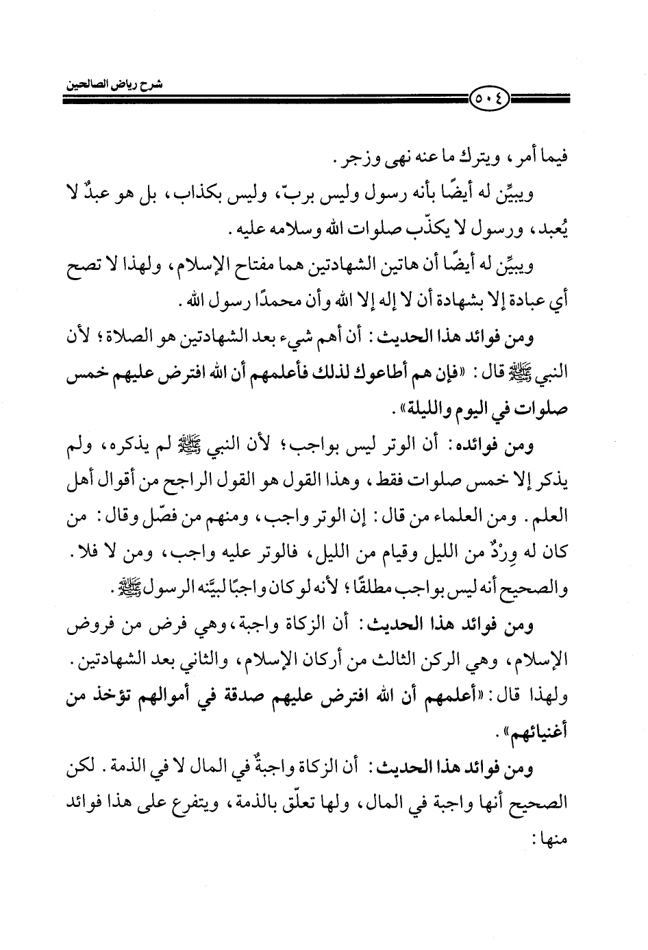 ومن فوائده: أن الوتر ليس بواجب؛ لأن النبي صلى الله عليه لم يذكره، ولم يذكر إلا خمس صلوات فقط، وهذا القول هو القول الراجح من أقوال أهل العلم. ومن العلماء من قال: إن الوتر واجب، ومنهم من فصّل وقال: من كان له وردٌ من الليل وقيام من الليل، فالوتر عليه واجب، ومن لا فلا. والصحيح أنه ليس بواجب مطلقاً؛ لأنه لو كان واجباً لبينه الرسول صلى الله عليه وسلم.