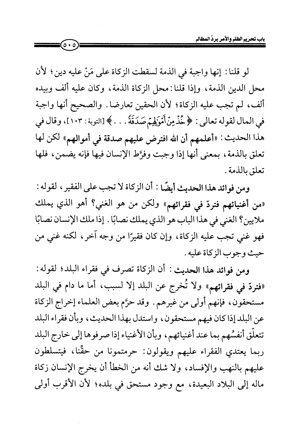 ومن فوائد هذا الحديث: أن الزكاة تصرف في فقراء البلد؛ لقوله: فتردّ في فقرائهم" ولا تُخرج عن البلد إلا لسبب، أما ما دام في البلد مستحقون فإنهم أولى من غيرهم. وقد حرم بعض العلماء إخراج الزكاة عن البلد إذا كان فيهم مستحقون، واستدل بهذا الحديث، وبأن فقراء البلد تتعلق أنفسُهم بما عند أغنيائهم، وبأن الأغنياء إذا صرفوها إلى خارج البلد ربما يتعدي الفقراء عليهم ويقولون: حرمتمونا من حقّنا، فيتسلطون عليهم بالنهب والإفساد، ولا شك أنه من الخطأ أن يخرج الإنسان زكاة ماله إلى البلاد البعيدة، مع وجود مستحق في بلده؛ لأن الأقرب أولى