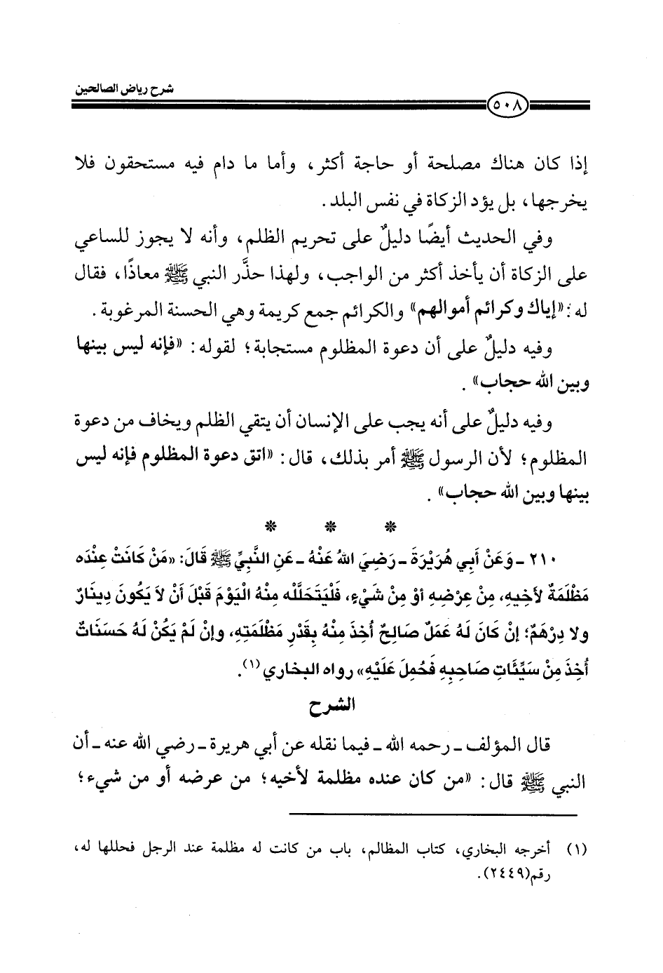 210- وعن أبي هريرة - رضي الله عنهُ- عن النبي صلى الله عليه وسلم قال: " من كانت عنده مظلمة لأخيه، من عرضه أو من شيٍ، فليتحلله منه اليوم قبل أن لا يكون دينار ولا درهم؛ إن كان له عمل صالحٌ أخذ منهُ بقدر مظلمتهِ، وإن لم يكن لهُ حسناتٌ أخذ من سيئات صاحبه فحمل عليه" رواه البخاري.