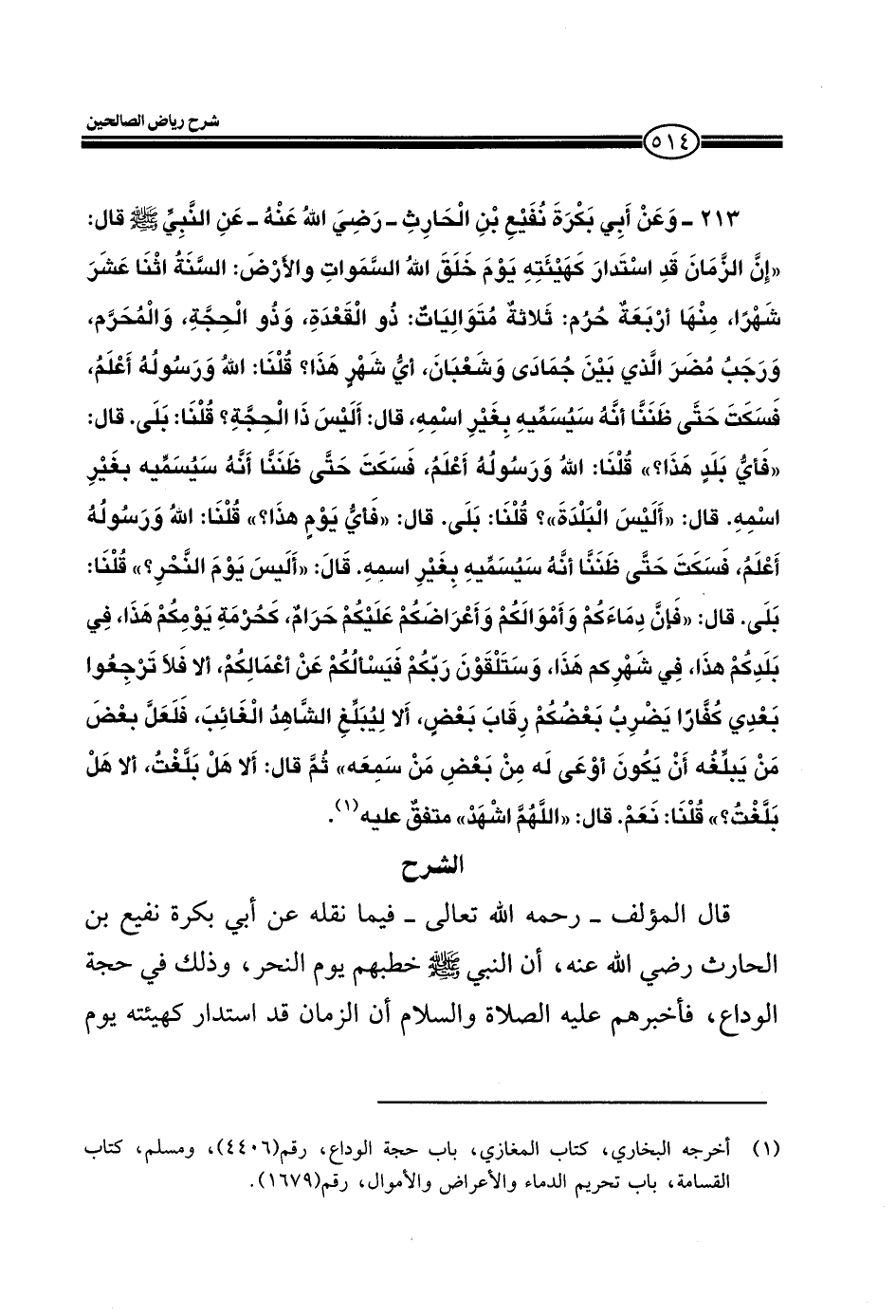 213- وعن أبي بكرة نفيع بن الحارث- رضي الله عنهُ- عن النبي صلى الله عليه وسل مقال: " إن الزمان قد استدار كهيئته يوم خلق الله السموات والأرض: السنة اثنا عشر شهراً، منها أربعةٌ حُرم: ثلاثةٌ متوالياتٌ: ذو القعدة وذو الحجة، والمحرم، ورجبُ مُضرَ الذي بين جمادى وشعبان، أي شهر هذا؟ قلنا: الله ورسوله أعلم " فسكت حتى ظننا أنهُ سيسميه بغير اسمه، قال أليس ذا الحجة؟ قلنا: بلى: قال " فأي بلد هذا؟: قلنا: الله ورسوله أعلم، فسكت حتى ظننا أنهُ سيسميه بغر اسمه قال: " اليس بالبلدة"؟ قلنا بلى. قال " فيُ يوم هذا؟ " قلنا: الله ورسوله أعلم، فسكت حتى ظننا أنه سيسميه بغير اسمه قال: " أليس يوم النحر؟ " قلنا: بلى قال: " فإن دماءكم وأموالكم وأعراضكم عليكم حرامٌ كحرمة يومكم هذا، في بلدكم هذا، في شهركم هذا، وستلقون ربكم فيسألكم عن أعمالكم، إلا فلا ترجعوا بعدي كفاراً يضرب بعضكم رقاب بعض، إلا ليبلغ الشهاد الغائب، فلعل بعض من يلغه أن يكون أوعى له من بعض من سمعه" ثم قال إلا هل بلغتُ، ألا هل بلغتُ؟ قلنا نعم. قال: " اللهم اشهد" متفق عليه.