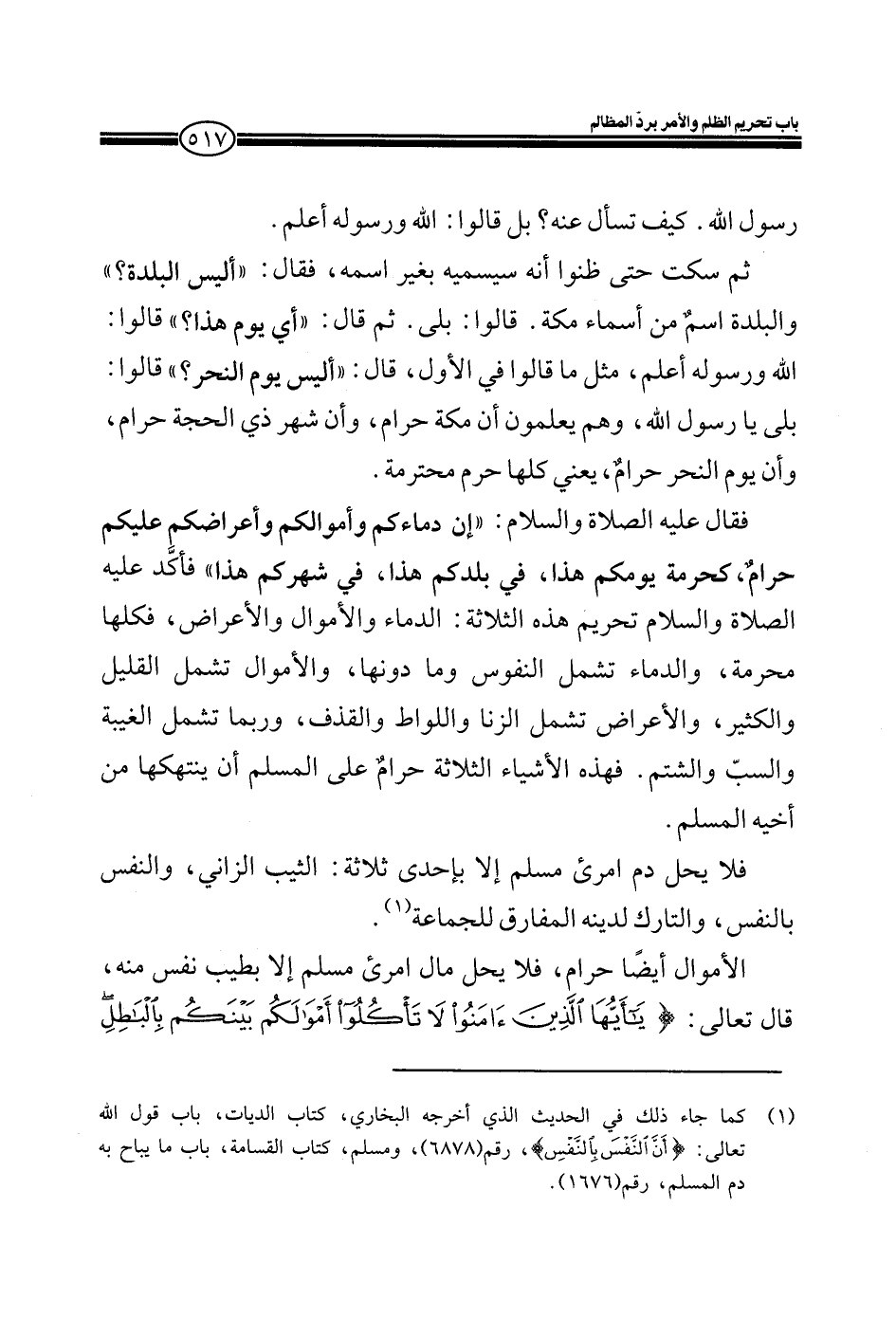 فقال عليه الصلاة والسلام: " إن دمائكم وأموالكم وأعراضكم عليكم حرام، كحرمة يومكم هذا، في بلدكم هذا، في شهركم هذا" فأكد عليه الصلاة والسلام تحريم هذه الثلاثة: الدماء والأموال والأعراض، فكلها محرمة، والدماء تشمل النفوس وما دونها، والأموال تشمل القليل والكثير، والأعراض تشمل الزنا واللواط والقذف، وربما تشمل الغيبة والسب والشتم. فهذه الأشياء الثلاثة حرامٌ على المسلم أن ينتهكها من أخيه المسلم.