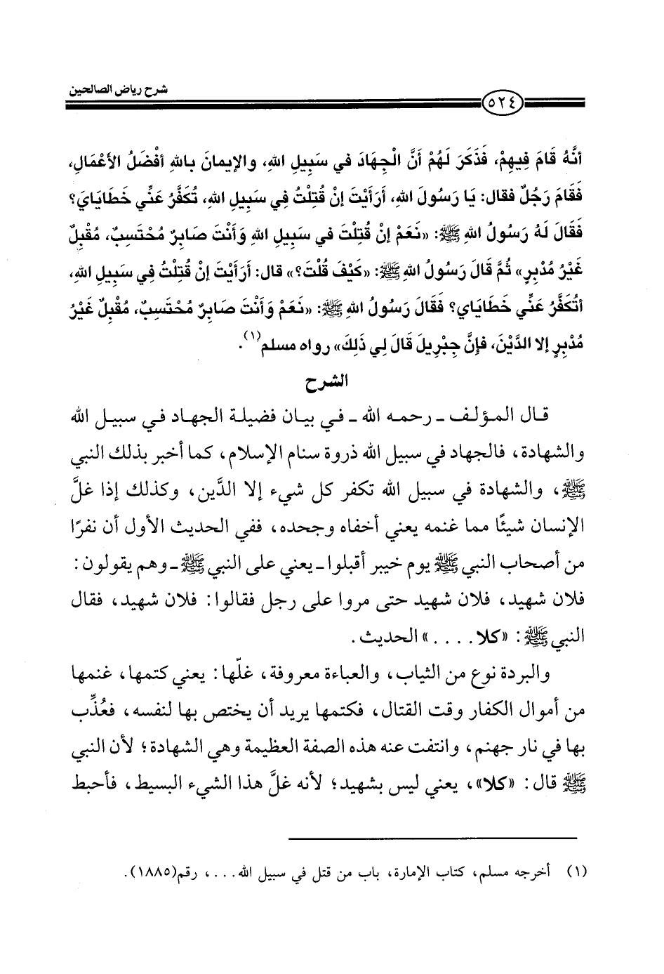 EXقال المؤلف -رحمه الله - في بيان فضيلة الجهاد في سبيل الله والشهادة، فالجهاد في سبيل الله ذروة سنام الإسلام، كما أخبر بذلك النبي صلى الله عليه وسلم والشهادة في سبيل الله تكفر كل شيء إلا الدين، وكذلك إذا غلّ الإنسان شيئاً مما غنمه يعني أخفاه وجحده، ففي الحديث الأول أن نفراً من أصحاب النبي صلى الله عليه وسلم يوم خيبر أقبلوا - يعني على النبي صلى الله عليه وسلم - وهم يقولون: فلان شهيد، فلان شهيد حتى مروا على رجل فقالوا: فلان شهيد، فقال النبي صلى الله عليه وسلم: " كلا ... " الحديث.