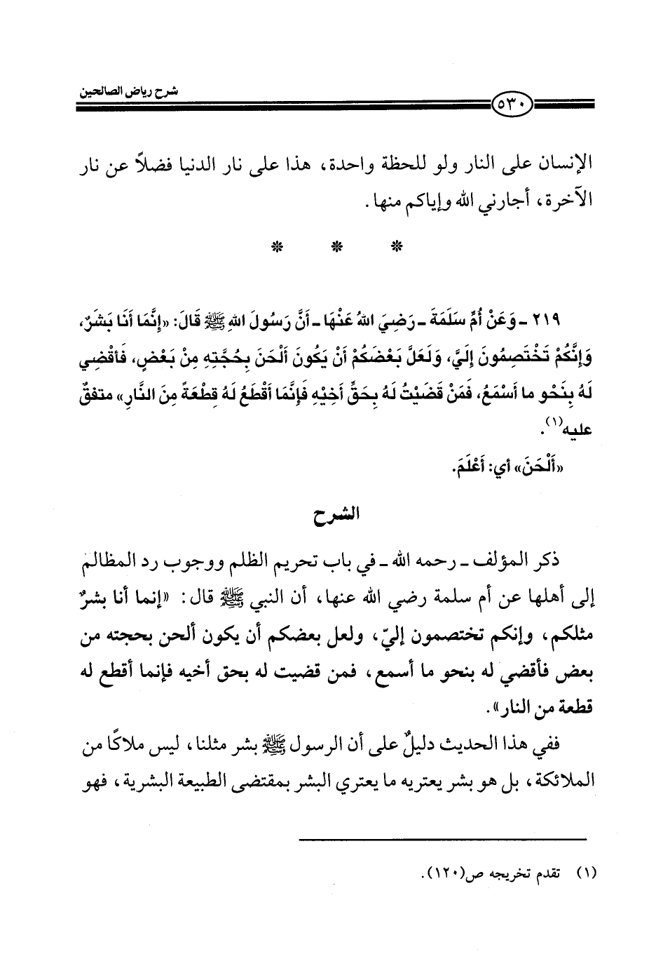 EXذكر المؤلف - رحمه الله - باب تحريم الظلم ووجوب رد المظالم إلى أهلها عن أم سلمة رضي الله عنها، أن النبي صلى الله عليه وسلم قال: " إنما أنا بشرٌ مثلكم، وإنكم تختصمون إليّ، ولعل بعضكم أو يكون ألحن بحجته من بعض فأقضي له بنحو ما أسمع، فمن قضيت له بحق أخيه فإنما أقطع له قطعة من النار".