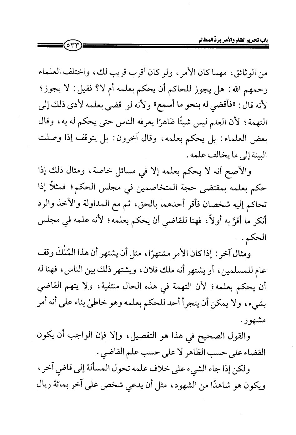 ومثال آخر: إذا كان مشتهراً، مثل أن يشتهر أن هذا المُلك وقف عام للمسلمين، أو يشتهر أنه ملك فلان، ويشتهر ذلك بين الناس، فهنا له أن يحكم بعلمه؛ لأن التهمة في هذه الحال منتفية، ولا يتهم القاضي بشيء، ولا يمكن أن يتجرأ أحد للحكم بعلمه وهو خاطئ بناء على أنه أمر مشهور.