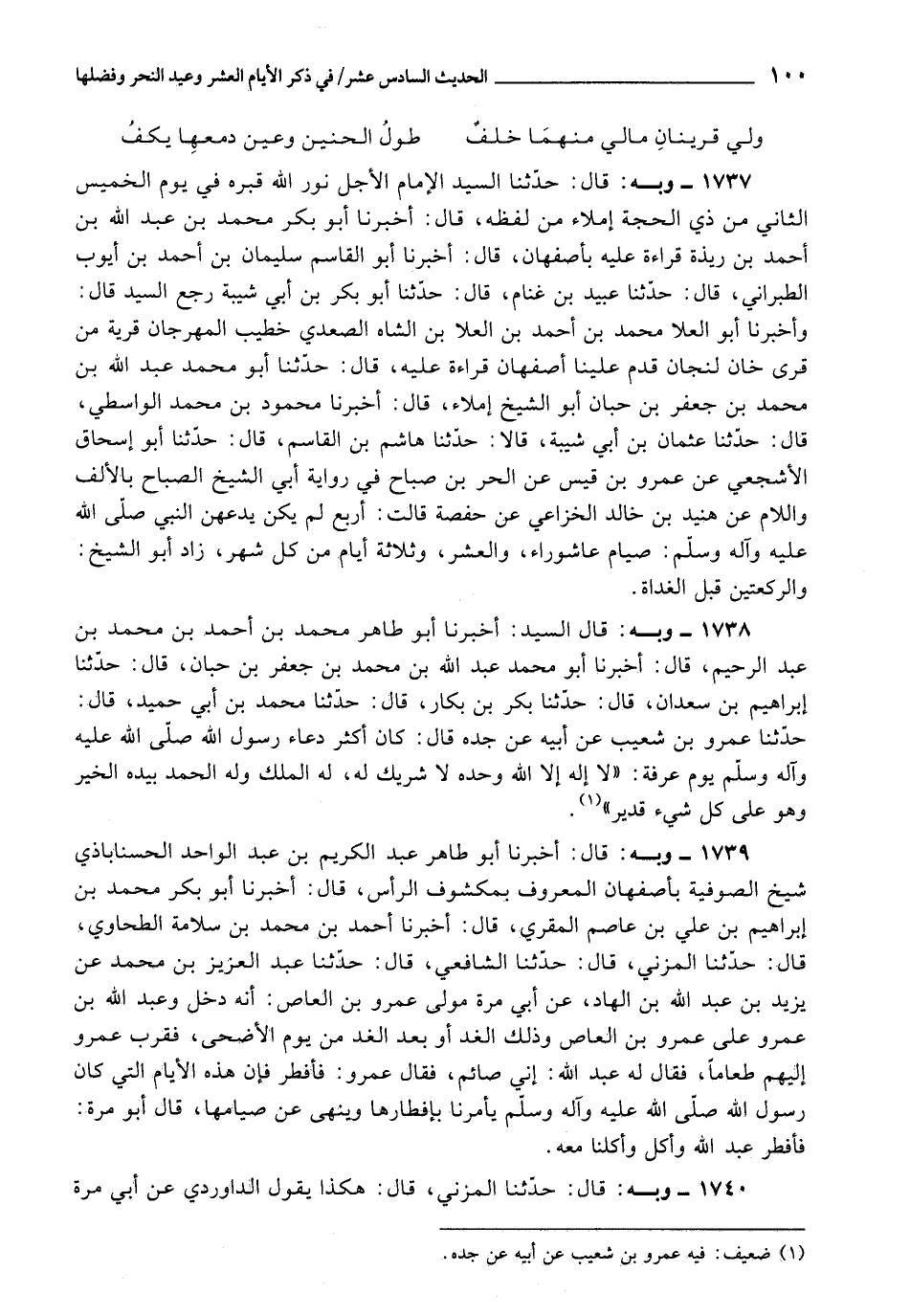 1739 - أَخْبَرَنَا أَبُو طَاهِرٍ عَبْدُ الْكَرِيمِ بْنُ عَبْدِ الْوَاحِدِ الْحَسَنَابَاذِي شَيْخُ الصُّوفِيَّةِ بِأَصْفَهَانَ الْمَعْرُوفُ بِمَكْشُوفِ الرَّأْسِ، قَالَ: أَخْبَرَنَا أَبُو بَكْرٍ مُحَمَّدُ بْنُ إِبْرَاهِيمَ بْنِ عَلِيِّ بْنِ عَاصِمٍ الْمُقْرِيُّ، قَالَ: أَخْبَرَنَا أَحْمَدُ بْنُ مُحَمَّدِ بْنِ سَلَامَةَ الطَّحَاوِيُّ، قَالَ: حَدَّثَنَا الْمُزْنِيُّ، قَالَ: حَدَّثَنَا الشَّافِعِيُّ، قَالَ: حَدَّثَنَا عَبْدُ الْعَزِيزِ بْنُ مُحَمَّدٍ، عَنْ يَزِيدَ بْنِ عَبْدِ اللَّهِ بْنِ الْهَادِ، عَنْ أَبِي مُرَّةَ مَوْلَى عَمْرِو بْنِ الْعَاصِ، أَنَّهُ دَخَلَ وَعَبْدُ اللَّهُ بْنُ عَمْرٍو عَلَى عَمْرِو بْنِ الْعَاصِ وَذَلِكَ الْغَدُ أَوْ بَعْدَ الْغَدِ مِنْ " يَوْمِ الْأَضْحَى، فَقَرَّبَ عَمْرٌو إِلَيْهِمْ طَعَامًا، فَقَالَ لَهُ عَبْدُ اللَّهِ: إِنِّي صَائِمٌ، فَقَالَ عَمْرٌو: فَأَفْطِرْ , فَإِنَّ هَذِهِ الْأَيَّامُ الَّتِي كَانَ رَسُولُ اللَّهِ صَلَّى اللَّهُ عَلَيْهِ وَآلِهِ وَسَلَّمَ يَأْمُرُنَا بِإِفْطَارِهَا وَيَنْهَى عَنْ صِيَامِهَا "، قَالَ أَبُو مُرَّةَ: فَأَفْطَرَ عَبْدُ اللَّهِ , وَأَكَلَ , وَأَكَلْنَا مَعَهُ.