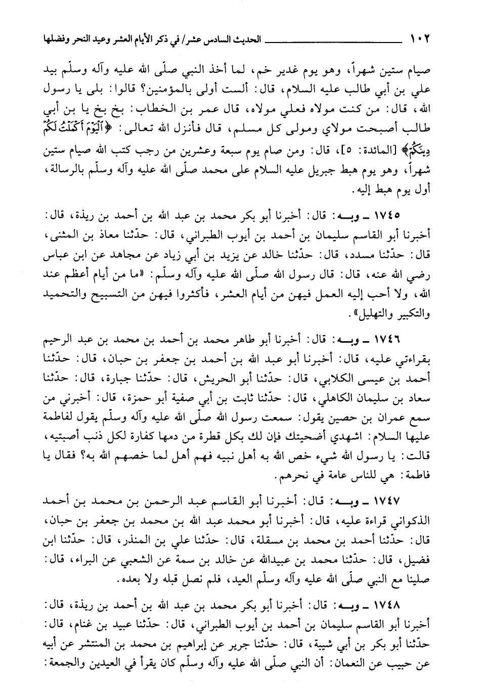 1746 - أَخْبَرَنَا أَبُو طَاهِرٍ مُحَمَّدُ بْنُ أَحْمَدَ بْنِ مُحَمَّدِ بْنِ عَبْدِ الرَّحِيمِ، بِقِرَاءَتِي عَلَيْهِ، قَالَ: أَخْبَرَنَا أَبُو عَبْدِ اللَّهِ بْنُ أَحْمَدَ بْنِ جَعْفَرِ بْنِ حِبَّانَ، قَالَ: حَدَّثَنَا أَحْمَدُ بْنُ عِيسَى الْكِلَابِيُّ، قَالَ: حَدَّثَنَا أَبُو الْحُرَيْشِ، قَالَ: حَدَّثَنَا جُبَارَةُ، قَالَ: حَدَّثَنَا سُعَادُ بْنُ سُلَيْمَانَ الْكَاهِلِيُّ، قَالَ: حَدَّثَنَا ثَابِتُ بْنُ أَبِي صَفِيَّةَ أَبُو حَمْزَةَ، قَالَ: أَخْبَرَنِي مَنْ سَمِعَ عِمْرَانَ بْنَ حُصَيْنٍ، يَقُولُ: سَمِعْتُ رَسُولَ اللَّهِ صَلَّى اللَّهُ عَلَيْهِ وَآلِهِ وَسَلَّمَ، يَقُولُ لِفَاطِمَةَ عَلَيْهَا السَّلَامُ: " اشْهَدِي أُضْحِيَتَكِ , فَإِنَّ لَكَ بِكُلِّ قَطْرَةٍ مِنْ دَمِهَا كَفَّارَةً لِكُلِّ ذَنْبٍ أَصَبْتِيهِ، قَالَتْ: يَا رَسُولَ اللَّهِ خَصَّ اللَّهُ بِهِ أَهْلَ نَبِيِّهِ فَهُمْ أَهْلٌ لِمَا خَصَّهُمُ اللَّهُ بِهِ؟ فَقَالَ يَا فَاطِمَةُ: هِيَ لِلنَّاسِ عَامَّةً فِي نَحْرِهِمْ "