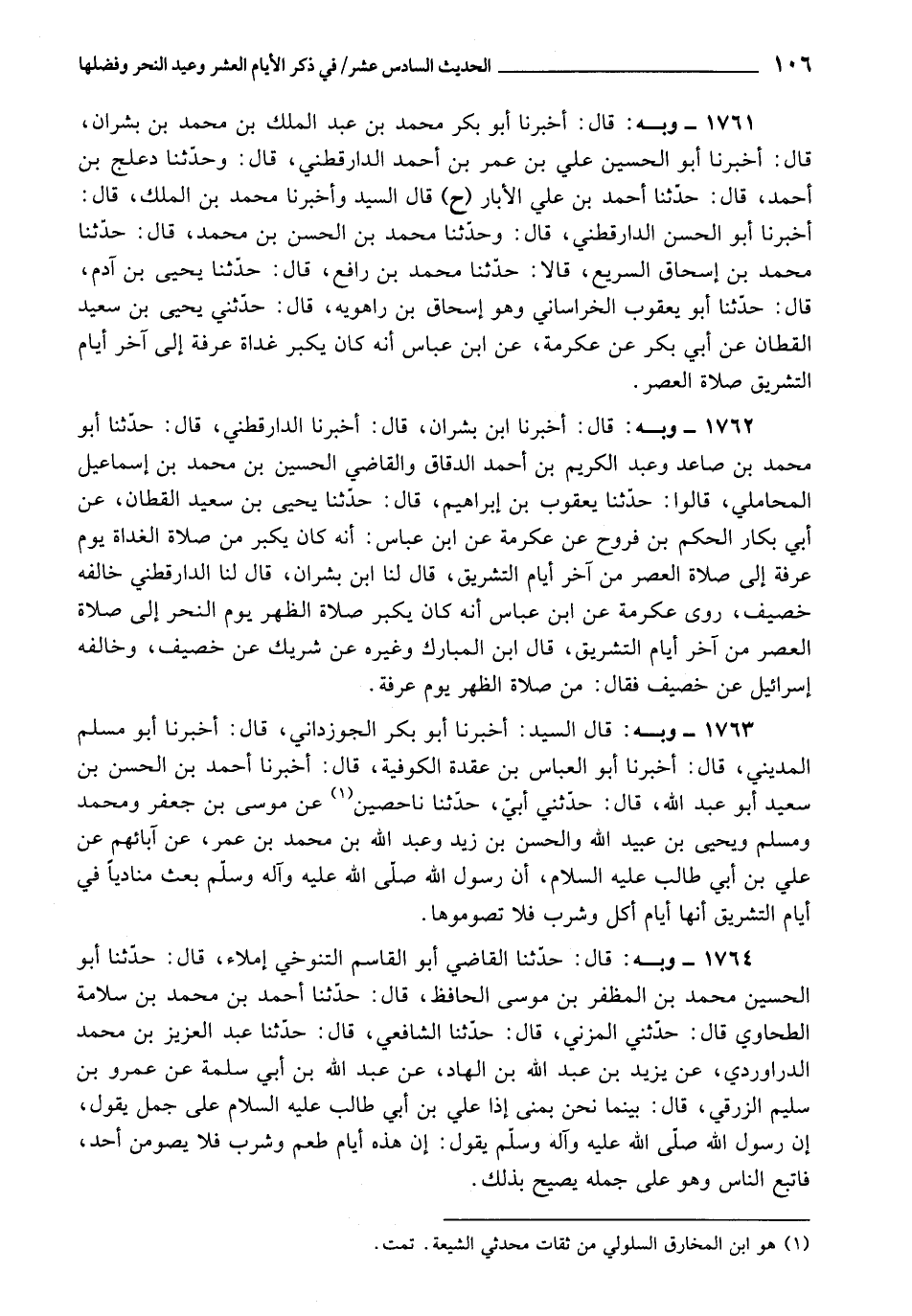 1761 - أَخْبَرَنَا أَبُو بَكْرٍ مُحَمَّدُ بْنُ عَبْدِ الْمَلِكِ بْنِ مُحَمَّدِ بْنِ بِشْرَانَ، قَالَ: أَخْبَرَنَا أَبُو الْحُسَيْنِ عَلِيُّ بْنُ عُمَرَ بْنِ أَحْمَدَ الدَّارَقُطْنِيُّ، قَالَ: وَحَدَّثَنَا دَعْلَجُ بْنُ أَحْمَدَ، قَالَ: حَدَّثَنَا أَحْمَدُ بْنُ عَلِيٍّ الْأَبَّارُ، قَالَ: السَّيِّدُ , وَأَخْبَرَنَا مُحَمَّدُ بْنُ الْمَلِكِ، قَالَ: أَخْبَرَنَا أَبُو الْحَسَنِ الدَّارَقُطْنِيُّ، قَالَ: وَحَدَّثَنَا مُحَمَّدُ بْنُ الْحَسَنِ بْنِ مُحَمَّدِ بْنِ رَافِعٍ، قَالَ: حَدَّثَنَا يَحْيَى بْنُ آدَمٍ، قَالَ: حَدَّثَنَا أَبُو يَعْقُوبَ الْخُرَاسَانِيُّ وَهُوَ إِسْحَاقُ بْنُ رَاهَوَيْهِ، قَالَ: حَدَّثَنِي يَحْيَى بْنُ سَعِيدٍ القَطَّانُ، عَنْ أَبِي بَكْرٍ، عَنْ عِكْرِمَةَ، عَنِ ابْنِ عَبَّاسٍ، أَنَّهُ كَانَ «يُكَبِّرُ غَدَاةَ عَرَفَةَ إِلَى آخِرِ أَيَّامِ التَّشْرِيقِ صَلَاةَ الْعَصْرِ»