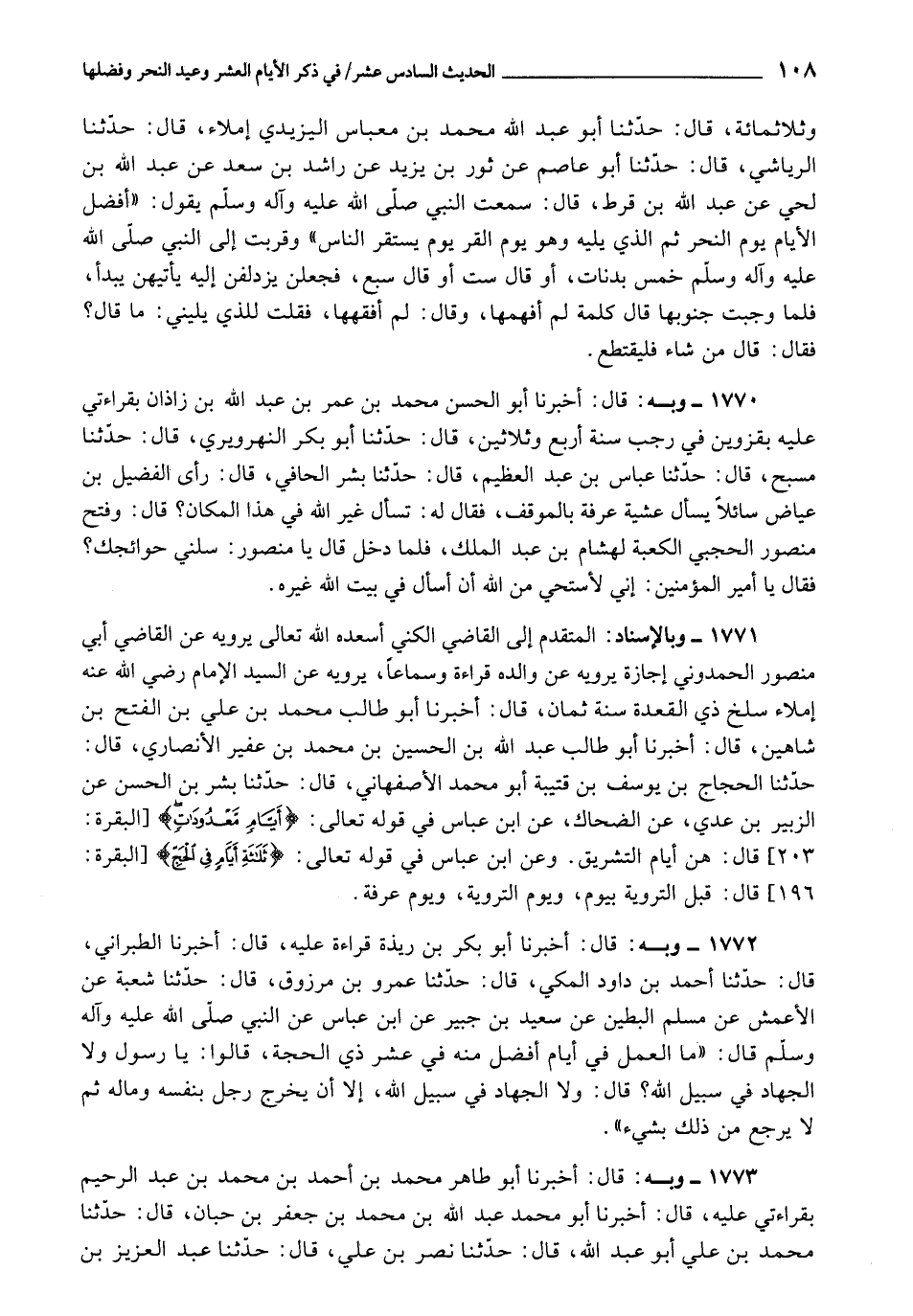 1772 - أَخْبَرَنَا أَبُو بَكْرِ بْنُ رَيْذَةَ، قِرَاءَةً عَلَيْهِ، قَالَ: أَخْبَرَنَا الطَّبَرَانِيُّ، قَالَ: حَدَّثَنَا أَحْمَدُ بْنُ دَاوُدَ الْمَكِّيُّ، قَالَ: حَدَّثَنَا عَمْرُو بْنُ مَرْزُوقٍ، قَالَ: حَدَّثَنَا شُعْبَةُ، عَنِ الْأَعْمَشِ، عَنْ مُسْلِمٍ الْبَطِينِ، عَنْ سَعِيدِ بْنِ جُبَيْرٍ، عَنِ ابْنِ عَبَّاسٍ، عَنِ النَّبِيِّ صَلَّى اللَّهُ عَلَيْهِ وَآلِهِ وَسَلَّمَ، قَالَ: " مَا الْعَمَلُ فِي أَيَّامٍ أَفْضَلُ مِنْهُ فِي عَشْرِ ذِي الْحِجَّةِ، قَالُوا: يَا رَسُولَ اللَّهِ وَلَا الْجِهَادُ فِي سَبِيلِ اللَّهِ؟ قَالَ: وَلَا الْجِهَادُ فِي سَبِيلِ اللَّهِ، إِلَّا أَنْ يَخْرُجَ رَجُلٌ بِنَفْسِهِ وَمَالِهِ , ثُمَّ لَا يَرْجِعُ مِنْ ذَلِكَ بِشَيْءٍ "
