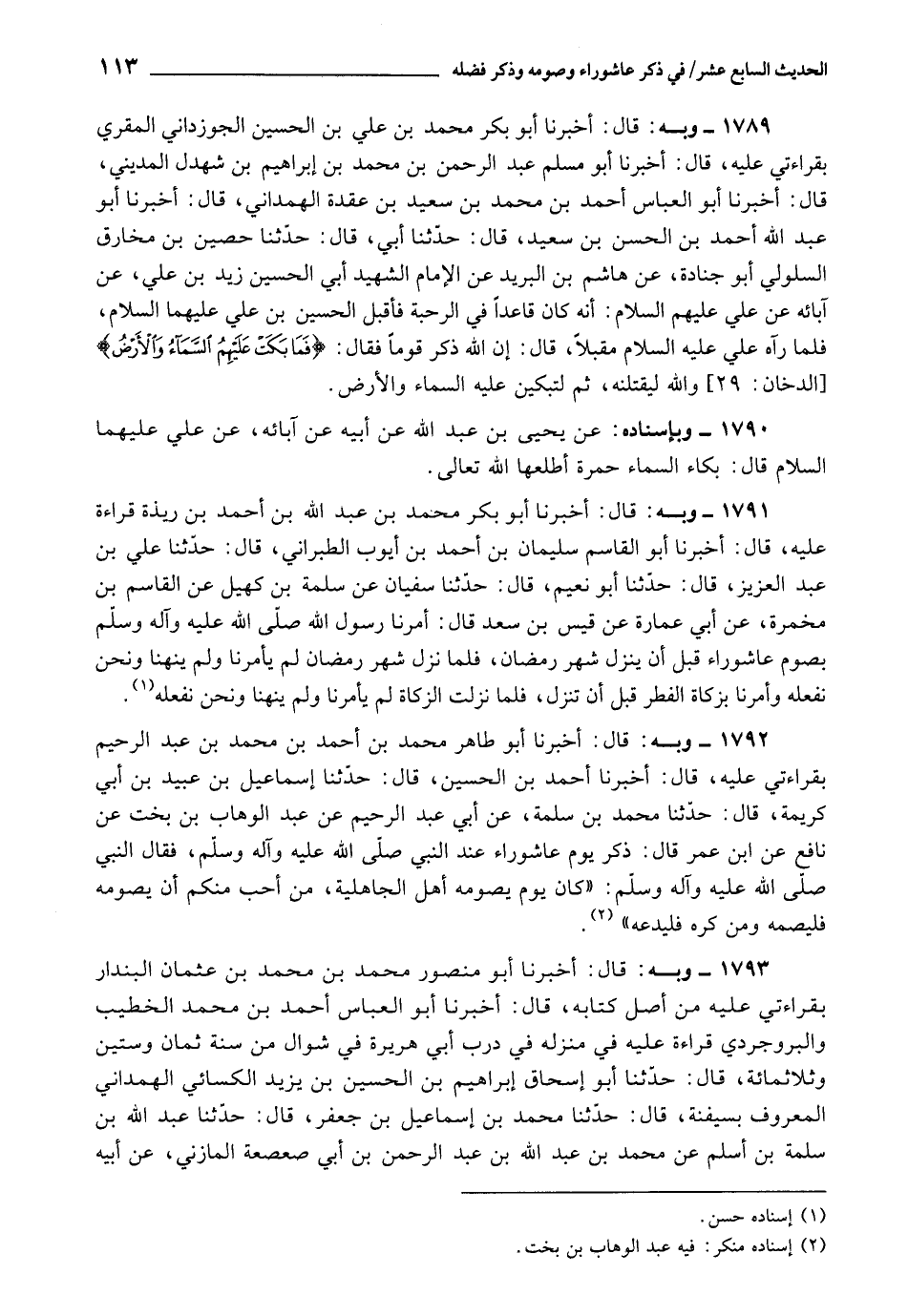 1792 - أَخْبَرَنَا أَبُو طَاهِرٍ مُحَمَّدُ بْنُ أَحْمَدَ بْنِ مُحَمَّدِ بْنِ عَبْدِ الرَّحِيمِ، بِقِرَاءَتِي عَلَيْهِ، قَالَ: أَخْبَرَنَا أَحْمَدُ بْنُ الْحُسَيْنِ، قَالَ: حَدَّثَنَا إِسْمَاعِيلُ بْنُ عُبَيْدِ ابْنِ أَبِي كَرِيمَةَ، قَالَ: حَدَّثَنَا مُحَمَّدُ بْنُ سَلَمَةَ، عَنْ أَبِي عَبْدِ الرَّحِيمِ، عَنْ عَبْدِ الْوَهَّابِ بْنِ بَخْتٍ، عَنْ نَافِعٍ، عَنِ ابْنِ عُمَرَ، قَالَ: " ذُكِرَ يَوْمُ عَاشُورَاءَ عِنْدَ النَّبِيِّ صَلَّى اللَّهُ عَلَيْهِ وَآلِهِ وَسَلَّمَ، فَقَالَ النَّبِيُّ صَلَّى اللَّهُ عَلَيْهِ وَآلِهِ وَسَلَّمَ: كَانَ يَوْمٌ يَصُومُهُ أَهْلُ الْجَاهِلِيَّةِ، مَنْ أَحَبَّ مِنْكُمْ أَنْ يَصُومَهُ , فَلْيَصُمْهُ , وَمَنْ كَرِهَ , فَلْيَدَعْهُ "