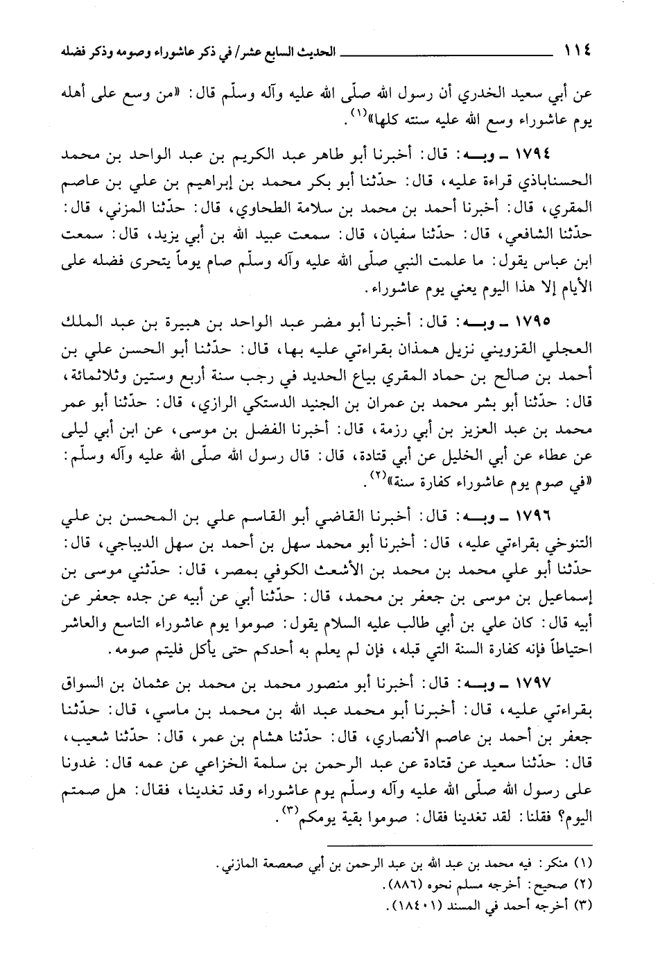 1795 - أَخْبَرَنَا أَبُو مُضَرٍ عَبْدُ الْوَاحِدِ بْنُ هُبَيْرَةَ بْنِ عَبْدِ الْمَلِكِ الْعِجْلِيُّ الْقَزْوِينِيُّ نَزِيلُ هَمَذَانَ، بِقِرَاءَتِي عَلَيْهِ بِهَا، قَالَ: حَدَّثَنَا أَبُو الْحَسَنِ عَلِيُّ بْنُ أَحْمَدَ بْنِ صَالِحِ بْنِ حَمَّادٍ الْمُقْرِيُّ بَيَّاعُ الْحَدِيدِ فِي رَجَبٍ سَنَةَ أَرْبَعٍ وَسِتِّينَ وَثَلاثِ مِائَةٍ، قَالَ: حَدَّثَنَا أَبُو بِشْرٍ مُحَمَّدُ بْنُ عِمْرَانَ بْنِ الْجُنَيْدِ الدَّسْتَكِيُّ الرَّازِيُّ، قَالَ: حَدَّثَنَا أَبُو عُمَرَ مُحَمَّدُ بْنُ عَبْدِ الْعَزِيزِ بْنِ أَبِي رُزْمَةَ، قَالَ: أَخْبَرَنَا الْفَضْلُ بْنُ مُوسَى، عَنِ ابْنِ أَبِي لَيْلَى، عَنْ عَطَاءٍ، عَنْ أَبِي الْخَلِيلِ، عَنْ أَبِي قَتَادَةَ، قَالَ: قَالَ رَسُولُ اللَّهِ صَلَّى اللَّهُ عَلَيْهِ وَآلِهِ وَسَلَّمَ: «فِي صَوْمِ يَوْمِ عَاشُورَاءَ كَفَّارَةُ سَنَةٍ»