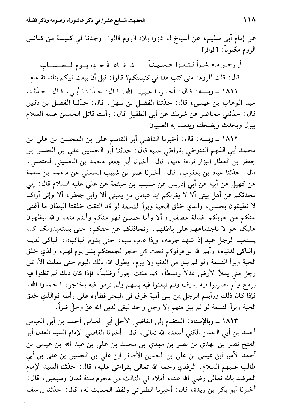 1811 - أَخْبَرَنَا عُبَيْدُ اللَّهِ، قَالَ: حَدَّثَنَا أَبِي، قَالَ: حَدَّثَنَا عَبْدُ الْوَهَّابِ بْنُ عِيسَى، قَالَ: حَدَّثَنَا الْفَضْلُ بْنُ سَهْلٍ، قَالَ: حَدَّثَنَا الْفَضْلُ بْنُ دُكَيْنٍ، قَالَ: حَدَّثَنِي مُحَاضِرٌ، عَنْ شَرِيكٍ، عَنْ أَبِي الطُّفَيْلِ، قَالَ: رَأَيْتُ قَاتِلَ الْحُسَيْنِ عَلَيْهِ السَّلَامُ يَبُولُ , وَيُحْدِثُ , وَيَضْحَكُ , وَيَلْعَبُ بِهِ الصِّبْيَانُ.