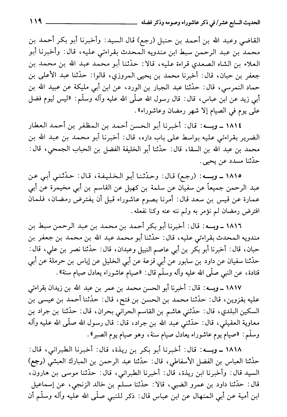 الْقَاضِي , وَعَبْدُ اللَّهِ بْنُ أَحْمَدَ بْنِ حَنْبَلٍ , رَجَعَ قَالَ السَّيِّدُ وَأَخْبَرَنَا أَبُو بَكْرٍ أَحْمَدُ بْنُ مُحَمَّدِ بْنِ عَبْدِ الرَّحْمَنِ سَبْطُ بْنُ مَنْدَوَيْهِ الْمُحَدِّثُ، بِقِرَاءَتِي عَلَيْهِ , قَالَ: وَأَخْبَرَنَا أَبُو الْعَلَاءِ بْنُ الشَّاهِ الصُّعَدِيُّ، قِرَاءَةً عَلَيْهِ، قَالَا: حَدَّثَنَا أَبُو مُحَمَّدٍ عَبْدُ اللَّهِ بْنُ مُحَمَّدِ بْنِ جَعْفَرِ بْنِ حِبَّانَ، قَالَ: أَخْبَرَنَا مُحَمَّدُ بْنُ يَحْيَى الْمَرْوَزِيُّ، قَالُوا: حَدَّثَنَا عَبْدُ الْأَعْلَى بْنُ حَمَّادٍ النُّمْرُسِيُّ، قَالَ: حَدَّثَنَا عَبْدُ الْجَبَّارِ بْنُ الْوَرْدِ، عَنِ ابْنِ أَبِي مُلَيْكَةَ، عَنْ عُبَيْدِ اللَّهِ بْنِ أَبِي زَيْدٍ، عَنِ ابْنِ عَبَّاسٍ، قَالَ: قَالَ رَسُولُ اللَّهِ صَلَّى اللَّهُ عَلَيْهِ وَآلِهِ وَسَلَّمَ: «لَيْسَ لِيَوْمٍ فَضْلٌ عَلَى يَوْمٍ فِي الصِّيَامِ إِلَّا شَهْرُ رَمَضَانَ وَعَاشُورَاءُ» .