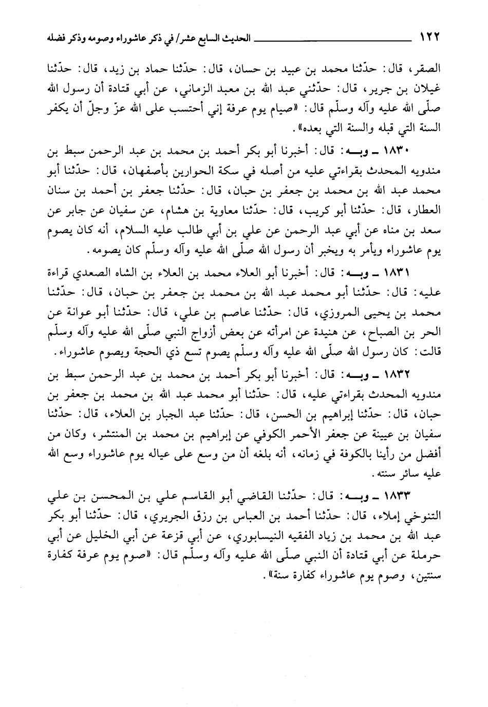 1833 - حَدَّثَنَا الْقَاضِي أَبُو الْقَاسِمِ عَلِيُّ بْنُ الْمُحَسِّنِ بْنِ عَلِيٍّ التَّنُوخِيُّ إِمْلَاءً، قَالَ: حَدَّثَنَا أَحْمَدُ بْنُ الْعَبَّاسِ بْنِ رِزْقٍ الْجَرِيرِيُّ، قَالَ: حَدَّثَنَا أَبُو بَكْرٍ عَبْدُ اللَّهِ بْنُ مُحَمَّدِ بْنِ زِيَادٍ الْفَقِيهُ النَّيْسَابُورِيُّ، عَنْ أَبِي قَزْعَةَ، عَنْ أَبِي الْخَلِيلِ، عَنْ أَبِي حَرْمَلَةَ، عَنْ أَبِي قَتَادَةَ، أَنَّ النَّبِيِّ صَلَّى اللَّهُ عَلَيْهِ وَآلِهِ وسَلَّمَ، قَالَ: «صَوْمُ يَوْمِ عَرَفَةَ كَفَّارَةُ سَنَتَيْنِ، وَصَوْمُ يَوْمِ عَاشُورَاءَ كَفَّارَةُ سَنَةٍ»