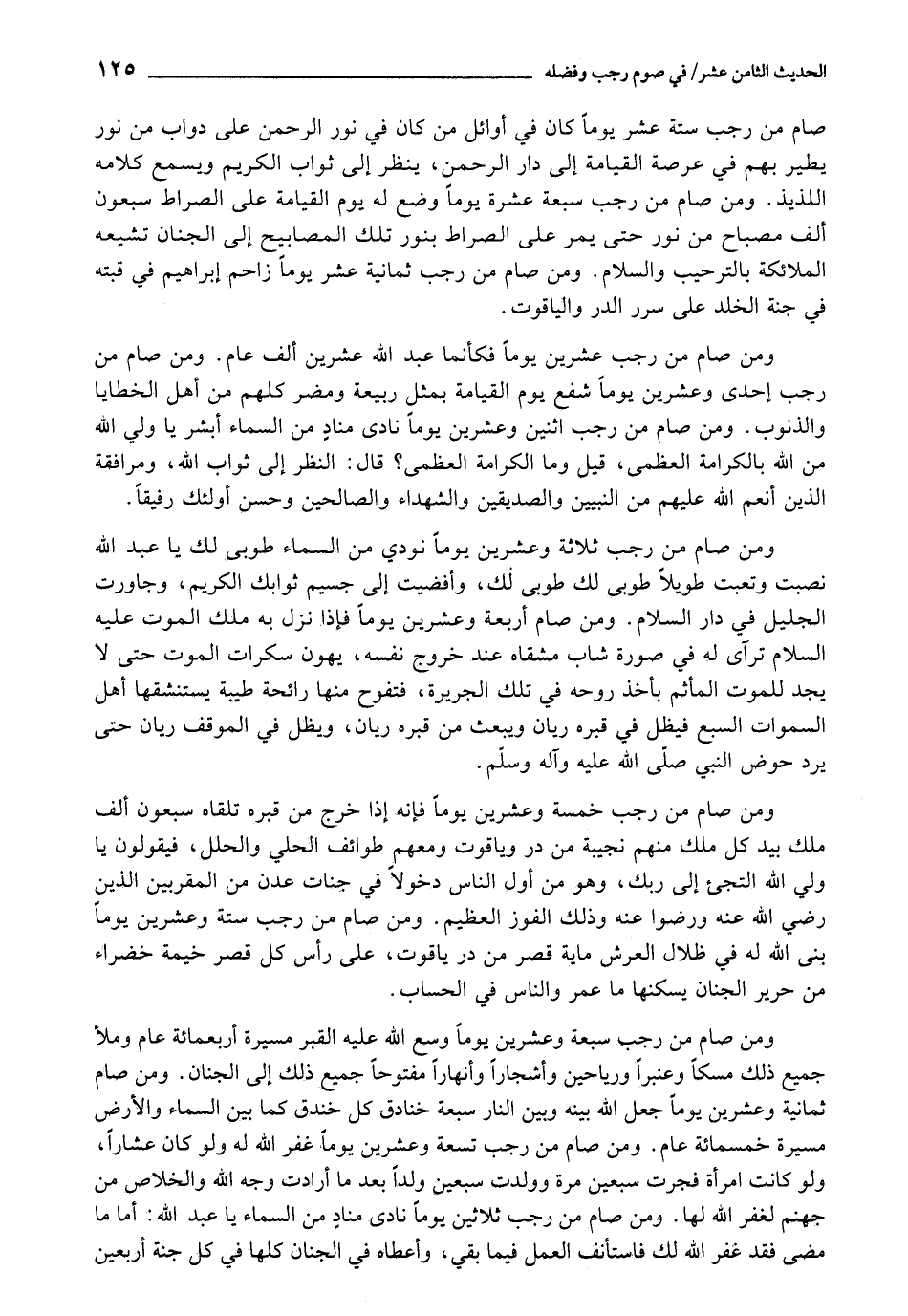 وَمَنْ صَامَ مِنْ رَجَبٍ ثَمَانِيَةَ عَشَرَ يَوْمًا , زَاحَمَ إِبْرَاهِيمَ فِي قُبَّتِهِ فِي جَنَّةِ الْخُلْدِ عَلَى سُرُرِ الدُّرِّ وَالْيَاقُوتِ.