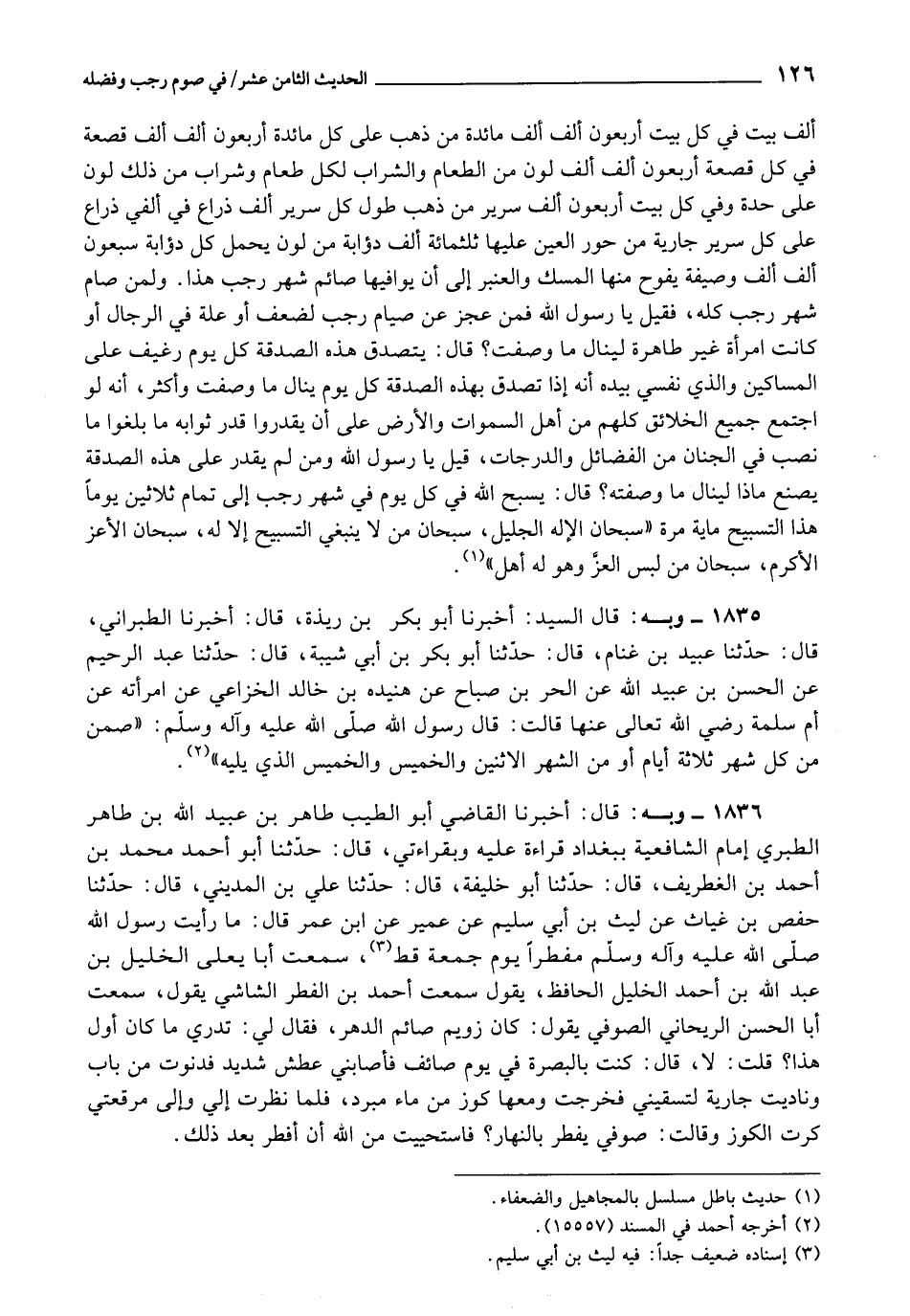 أَلْفَ بَيْتٍ فِي كُلِّ بَيْتٍ أَرْبَعُونَ أَلْفِ أَلْفِ مَائِدَةٍ مِنْ ذَهَبٍ عَلَى كُلِّ مَائِدَةٍ أَرْبَعُونَ أَلْفِ أَلْفِ قَصْعَةً فِي كُلِّ قَصْعَةٍ أَرْبَعُونَ أَلْفِ أَلْفِ لَوْنٍ مِنَ الطَّعَامِ وَالشَّرَابِ , لِكُلِّ طَعَامٍ وَشَرَابٍ مِنْ ذَلِكَ لَوْنٌ عَلَى حِدَةٍ , وَفِي كُلِّ بَيْتٍ أَرْبَعُونَ أَلْفِ سَرِيرٍ مِنْ ذَهَبٍ طُولُ كُلِّ سَرِيرٍ أَلْفُ ذِرَاعٍ , فِي أَلْفَيْ ذِرَاعٍ عَلَى كُلِّ سَرِيرٍ جَارِيَةٌ مِنْ حُورِ الْعِينِ عَلَيْهَا ثَلاثُ مِائَةِ أَلْفِ دُؤَابَةٍ مِنْ لَوْنٍ يَحْمِلُ كُلُّ دُؤَابَةٍ سَبْعُونَ أَلْفِ أَلْفِ وَصِيفَةٍ يَفُوحُ مِنْهَا الْمِسْكُ وَالْعَنْبَرُ إِلَى أَنْ يُوَافِيَهَا صَائِمُ شَهْرِ رَجَبٍ هَذَا.