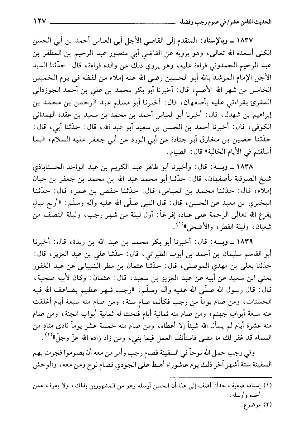 1837 - أَخْبَرَنَا أَبُو بَكْرٍ مُحَمَّدُ بْنُ عَلِيِّ بْنِ أَحْمَدَ الْجُوزْدَانِيُّ الْمُقْرِيُّ، بِقِرَاءَتِي عَلَيْهِ بِأَصْفَهَانَ، قَالَ: أَخْبَرَنَا أَبُو مُسْلِمٍ عَبْدُ الرَّحْمَنِ بْنُ مُحَمَّدِ بْنِ إِبْرَاهِيمَ بْنِ شَهْدَلٍ، قَالَ: أَخْبَرَنَا أَبُو الْعَبَّاسِ أَحْمَدُ بْنُ مُحَمَّدِ بْنِ سَعِيدِ بْنِ عُقْدَةَ الْهَمْدَانِيُّ الْكُوفِيُّ، قَالَ: أَخْبَرَنَا أَحْمَدُ بْنُ الْحَسَنِ بْنِ سَعِيدِ بْنِ أَبِي عَبْدِ اللَّهِ، قَالَ: حَدَّثَنَا أَبِي، قَالَ: حَدَّثَنَا حُصَيْنُ بْنُ مُخَارِقٍ أَبُو جُنَادَةَ، عَنْ أَبِي الْوَرْدِ، عَنْ أَبِي جَعْفَرٍ عَلَيْهِ السَّلَامُ، {بِمَا أَسْلَفْتُمْ فِي الأَيَّامِ الْخَالِيَةِ} [الحاقة: 24] قَالَ: الصِّيَامُ.