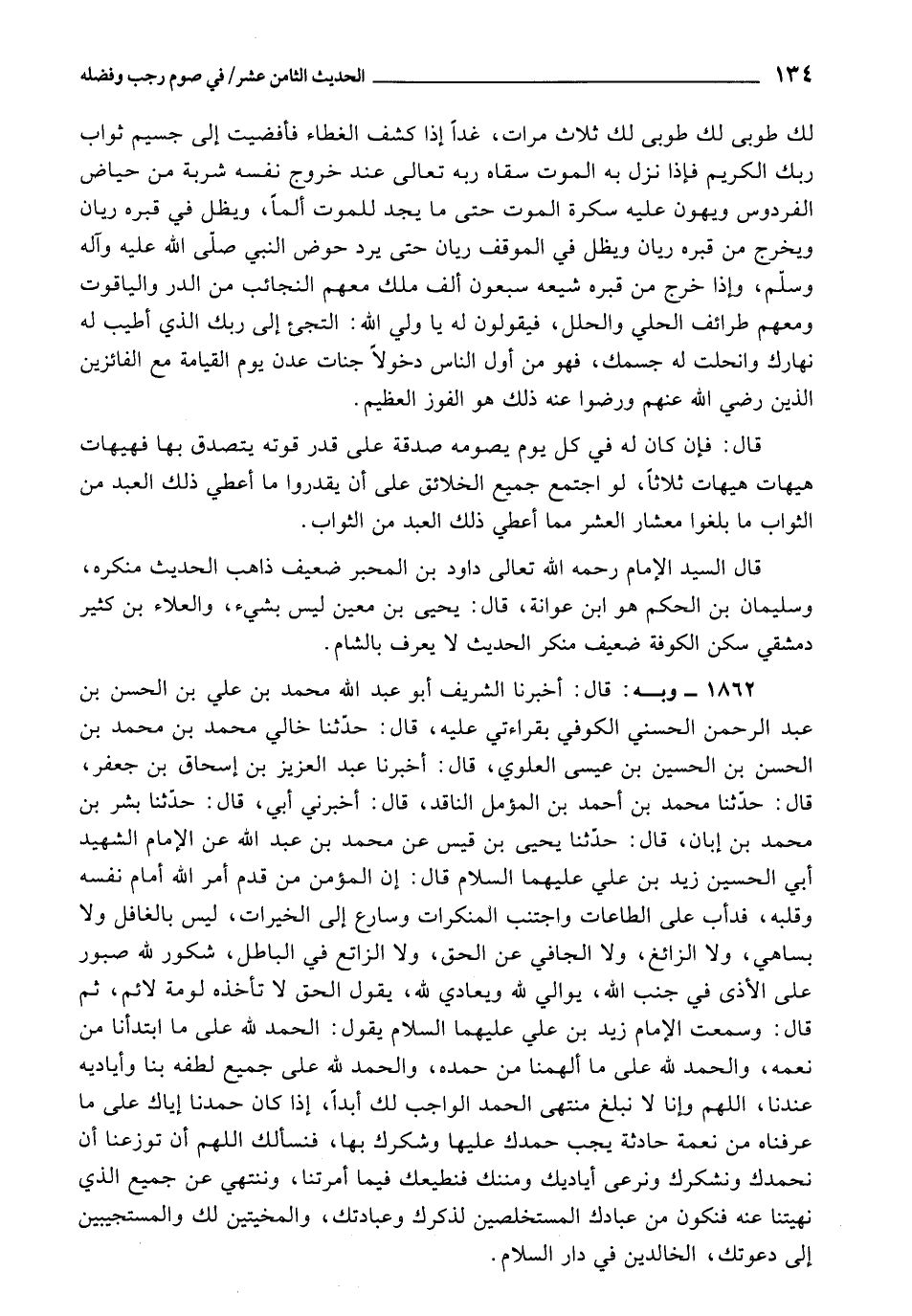 1862 - أَخْبَرَنَا الشَّرِيفُ أَبُو عَبْدِ اللَّهِ مُحَمَّدُ بْنُ عَلِيِّ بْنُ الْحَسَنِ بْنِ عَبْدِ الرَّحْمَنِ الْحَسَنِيِّ الْكُوفِيِّ، بِقِرَاءَتِي عَلَيْهِ، قَالَ: حَدَّثَنَا خَالِي مُحَمَّدُ بْنُ مُحَمَّدِ بْنِ الْحَسَنِ بْنِ الْحُسَيْنِ بْنِ عِيسَى الْعَلَوِيُّ، قَالَ: أَخْبَرَنَا عَبْدُ الْعَزِيزِ بْنُ إِسْحَاقَ بْنِ جَعْفَرٍ، قَالَ: حَدَّثَنَا مُحَمَّدُ بْنُ أَحْمَدَ بْنِ الْمُؤَمِّلِ النَّاقِدُ، قَالَ: أَخْبَرَنِي أَبِي، قَالَ: حَدَّثَنَا بِشْرُ بْنُ مُحَمَّدِ بْنِ أَبَانٍ، قَالَ: حَدَّثَنَا يَحْيَى بْنُ قَيْسٍ، عَنْ مُحَمَّدِ بْنِ عَبْدِ اللَّهِ، عَنِ الْإِمَامِ الشَّهِيدِ أَبِي الْحُسَيْنِ زَيْدِ بْنِ عَلِيٍّ عَلَيْهِمَا السَّلَامُ، قَالَ: إِنَّ الْمُؤْمِنَ مَنْ قَدَّمَ أَمْرَ اللَّهِ أَمَامَ نَفْسِهِ , وَقَلْبِهِ، فَدَأَبَ عَلَى الطَّاعَاتِ , وَاجْتَنَبَ الْمُنْكَرَاتِ , وَسَارَعَ إِلَى الْخَيْرَاتِ، لَيْسَ بِالْغَافِلِ , وَلَا بِسَاهِي، وَلَا الزَّائِغِ، وَلَا الْجَافِي عَنِ الْحَقِّ، وَلَا الرَّاتِعِ في الباطل، شكور لله صبور على الأذى في جنب الله، يوالي لله ويعادي لله، يَقُولُ الْحَقَّ لَا تَأْخُذُهُ لَوْمَةُ لَائِمٍ، ثُمَّ قَالَ: وَسَمِعْتُ الْإِمَامَ زَيْدَ بْنَ عَلِيٍّ عَلَيْهِمَا السَّلَامُ، يَقُولُ: الْحَمْدُ لِلَّهِ عَلَى مَا ابْتَدَأَنَا مِنْ نِعْمَةٍ، وَالْحَمْدُ لِلَّهِ عَلَى مَا أَلْهَمَنَا مِنْ حَمْدِهِ، وَالْحَمْدُ لِلَّهِ عَلَى جَمِيعِ لُطْفِهِ بِنَا , وَأَيَادِيهِ عِنْدَنَا، وَإِنَّا لَا نَبْلُغُ مُنْتَهَى الْحَمْدِ الْوَاجِبِ لَكَ أَبَدًا، إِذَا كَانَ حَمْدُنَا إِيَّاكَ عَلَى مَا عَرَفْنَاهُ مِنْ نِعْمَةٍ حَادِثَةٍ يَجِبُ حَمْدُكَ عَلَيْهَا وَشُكْرُكَ بِهَا، فَنَسْأَلُكَ اللَّهُمَّ أَنْ تُوزِعَنَا أَنْ نَحْمَدَكَ , وَنَشْكُرَكَ , وَنَرْعَى أَيَادِيَكَ وَمِنَنَكَ , فَنُطِيعَكَ فِيمَا أَمَرْتَنَا، وَنَنْتَهِيَ عَنْ جَمِيعِ الَّذِي نَهَيْتَنَا عَنْهُ فَنَكُونَ مِنْ عِبَادِكَ الْمُسْتَخْلَصِينَ لِذِكْرِكَ , وَعِبَادَتِكَ، وَالْمُخْبِتِينَ لَكَ، وَالْمُسْتَجِيبِينَ إِلَى دَعْوَتِكَ، الْخَالِدِينَ فِي دَارِ السَّلَامِ.
