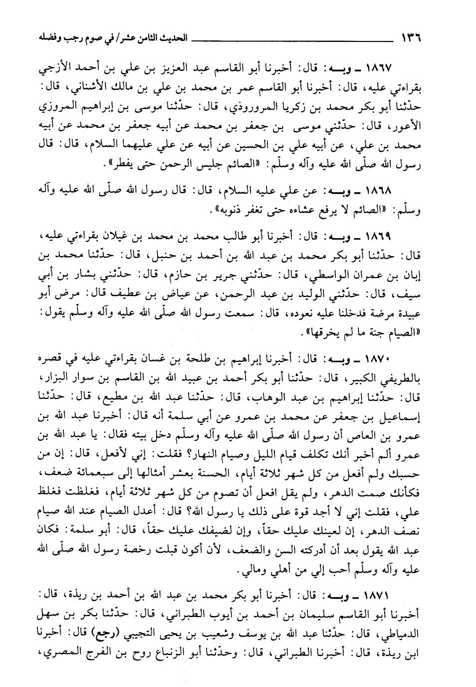1867 - أَخْبَرَنَا أَبُو الْقَاسِمِ عَبْدُ الْعَزِيزِ بْنُ عَلِيِّ بْنِ أَحْمَدَ الْأَزَجِيُّ، بِقِرَاءَتِي عَلَيْهِ، قَالَ: أَخْبَرَنَا أَبُو الْقَاسِمِ عُمَرُ بْنُ مُحَمَّدِ بْنِ عَلِيِّ بْنِ مَالِكٍ الْأُشْنَانِيُّ، قَالَ: حَدَّثَنَا أَبُو بَكْرٍ مُحَمَّدُ بْنُ زَكَرِيَّا الْمَرْوَرُّوذِيُّ، قَالَ: حَدَّثَنَا مُوسَى بْنُ إِبْرَاهِيمَ الْمَرْوَزِيُّ الْأَعْوَرُ، قَالَ: حَدَّثَنِي مُوسَى بْنُ جَعْفَرِ بْنِ مُحَمَّدٍ، عَنْ أَبِيهِ جَعْفَرِ بْنِ مُحَمَّدٍ، عَنْ أَبِيهِ مُحَمَّدِ بْنِ عَلِيٍّ، عَنْ أَبِيهِ عَلِيِّ بْنِ الْحُسَيْنِ عَنْ أَبِيهِ، عَنْ عَلِيٍّ عَلَيْهِمَا السَّلَامُ، قَالَ: قَالَ رَسُولُ اللَّهِ صَلَّى اللَّهُ عَلَيْهِ وَآلِهِ وَسَلَّمَ: «الصَّائِمُ جَلِيسُ الرَّحْمَنِ , حَتَّى يُفْطِرَ»