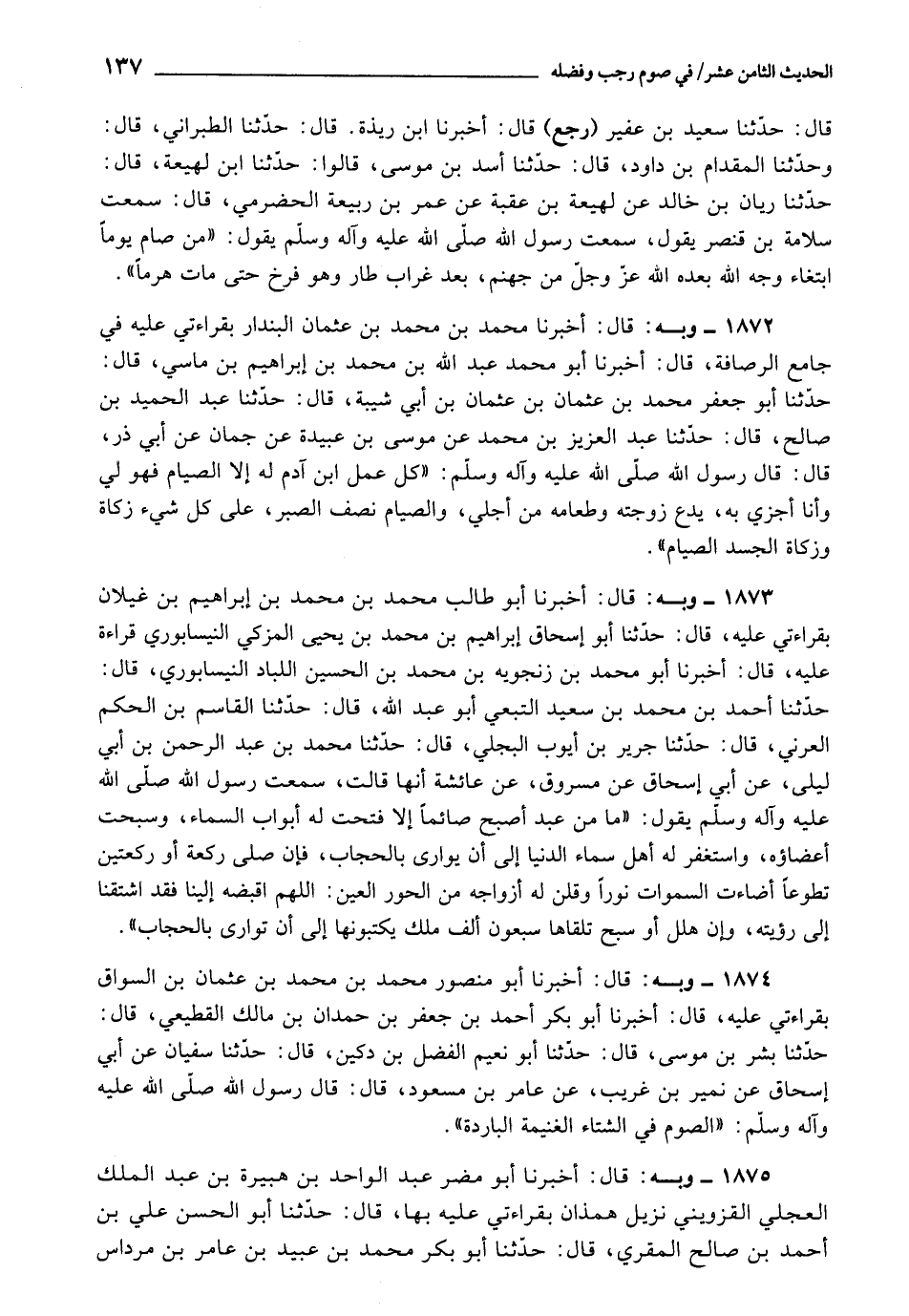 1874 - أَخْبَرَنَا أَبُو مَنْصُورٍ مُحَمَّدُ بْنُ عُثْمَانَ بْنِ السَّوَّاقِ، بِقِرَاءَتِي عَلَيْهِ، قَالَ: أَخْبَرَنَا أَبُو بَكْرٍ أَحْمَدُ بْنُ جَعْفَرِ بْنِ حَمْدَانَ بْنِ مَالِكٍ الْقَطِيعِيُّ، قَالَ: حَدَّثَنَا بِشْرُ بْنُ مُوسَى، قَالَ: حَدَّثَنَا أَبُو نُعَيْمٍ الْفَضْلُ بْنُ دُكَيْنٍ، قَالَ: حَدَّثَنَا سُفْيَانُ عَنْ أَبِي إِسْحَاقَ، عَنْ نُمَيْرِ بْنِ غَرِيبٍ، عَنْ عَامِرِ بْنِ مَسْعُودٍ، قَالَ: قَالَ رَسُولُ اللَّهِ صَلَّى اللَّهُ عَلَيْهِ وَآلِهِ وَسَلَّمَ: «الصَّوْمُ فِي الشِّتَاءِ الْغَنِيمَةُ الْبَارِدَةُ»