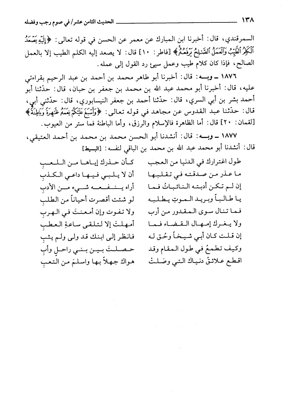 1877 - قَالَ: أَنْشَدَنَا أَبُو الْحَسَنِ مُحَمَّدُ بْنُ مُحَمَّدِ بْنِ أَحْمَدَ الْعَتِيقِيُّ، قَالَ: أَنْشَدَنَا أَبُو مُحَمَّدٍ عَبْدُ اللَّهِ بْنُ مُحَمَّدِ بْنِ الْبَاقِي لِنَفْسِهِ: