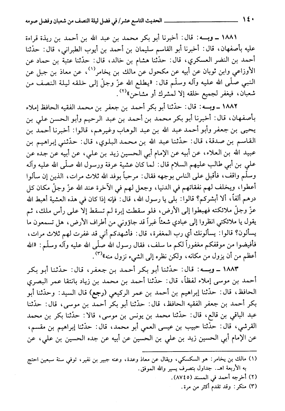 1881 - أَخْبَرَنَا أَبُو بَكْرٍ مُحَمَّدُ بْنُ عَبْدِ اللَّهِ بْنِ أَحْمَدَ بْنِ رَيْذَةَ، قِرَاءَةً عَلَيْهِ بِأَصْفَهَانَ، قَالَ: أَخْبَرَنَا أَبُو الْقَاسِمِ سُلَيْمَانُ بْنُ أَحْمَدَ بْنِ أَيُّوبَ الطَّبَرَانِيُّ، قَالَ: حَدَّثَنَا أَحْمَدُ بْنُ النَّضْرِ الْعَسْكَرِيُّ، قَالَ: حَدَّثَنَا هِشَامُ بْنُ خَالِدٍ، قَالَ: حَدَّثَنَا عُتْبَةُ بْنُ حَمَّادٍ، عَنِ الْأَوْزَاعِيِّ، وَابْنِ ثَوْبَانَ، عَنْ أَبِيهِ، عَنْ مَكْحُولِ بْنِ يُخَامِرَ، عَنْ مُعَاذِ بْنِ جَبَلٍ، عَنِ النَّبِيِّ صَلَّى اللَّهُ عَلَيْهِ وَآلِهِ وَسَلَّمَ، قَالَ: «يَطَّلِعُ اللَّهُ عَزَّ وَجَلَّ إِلَى خَلْقِهِ لَيْلَةَ النِّصْفِ مِنْ شَعْبَانَ، فَيَغْفِرُ لِجَمِيعِ خَلْقِهِ , إِلَّا لِمُشْرِكٍ , أَوْ مُشَاحِنٍ»