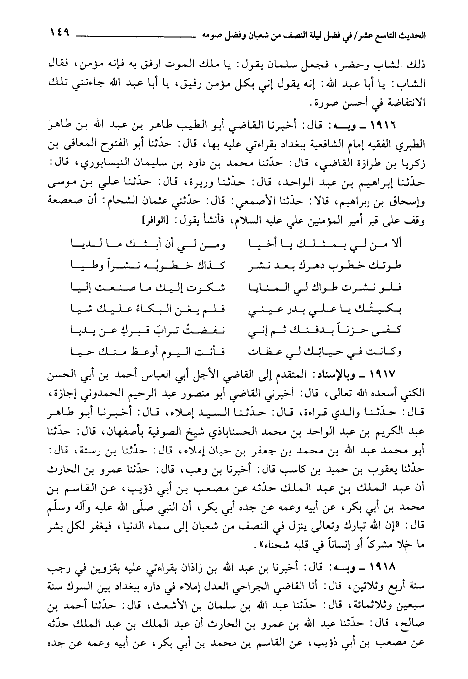1917 - وَبِالْإِسْنَادِ الْمُتَقَدِّمِ إِلَى الْقَاضِي الْأَجَلِّ أَبِي الْعَبَّاسِ أَحْمَدَ بْنِ أَبِي الْحَسَنِ الْكنيِّ , أسْعَدَهُ اللَّهُ تَعَالَى، قَالَ: أَخْبَرَنِي الْقَاضِي أَبُو مَنْصُورٍ عَبْدُ الرَّحِيمِ الْحَمْدُونِيُّ إِجَازَةً، قَالَ: حَدَّثَنَا وَالِدِي قِرَاءَةً، قَالَ: حَدَّثَنَا السَّيِّدُ , إمْلَاءً، قَالَ: أَخْبَرَنَا أَبُو طَاهِرٍ عَبْدُ الْكَرِيمِ بْنُ عَبْدِ الْوَاحِدِ بْنِ مُحَمَّدٍ الْحَسَنَابَاذِيُّ شَيْخُ الصُّوفِيَّةِ , بِأَصْفَهَانَ، قَالَ: حَدَّثَنَا أَبُو مُحَمَّدٍ عَبْدُ اللَّهِ بْنُ مُحَمَّدِ بْنِ جَعْفَرِ بْنِ حِبَّانَ إمْلَاءً، قَالَ: حَدَّثَنَا ابْنُ رُسْتَةَ، قَالَ: حَدَّثَنَا يَعْقُوبُ بْنُ حُمَيْدِ بْنِ كَاسِبٍ، قَالَ: أَخْبَرَنَا ابْنُ وَهْبٍ، قَالَ: حَدَّثَنَا عَمْرُو بْنُ الْحَارِثِ , أنَّ عَبْدَ الْمَلِكِ بْنَ عَبْدِ الْمَلِكِ، حَدَّثَهُ، عَنْ مُصْعَبِ بْنِ أَبِي ذُؤَيْبٍ، عَنِ الْقَاسِمِ بْنِ مُحَمَّدِ بْنِ أَبِي بَكْرٍ، عَنْ أَبِيهِ وَعَمِّهِ , وَجَدِّهِ أَبِي بَكْرٍ، أَنّ النَّبِيَّ صَلَّى اللَّهُ عَلَيْهِ وَآلِهِ وَسَلَّمَ، قَالَ: «إِنَّ اللَّهَ تَبَارَكَ وَتَعَالَى يَنْزِلُ فِي النِّصْفِ مِنْ شَعْبَانَ إِلَى سَمَاءِ الدُّنْيَا، فَيَغْفِرُ لِكُلِّ بَشَرٍ , مَا خَلَا مُشْرِكًا , أَوْ إِنْسَانًا فِي قَلْبِهِ شَحْنَاءُ»