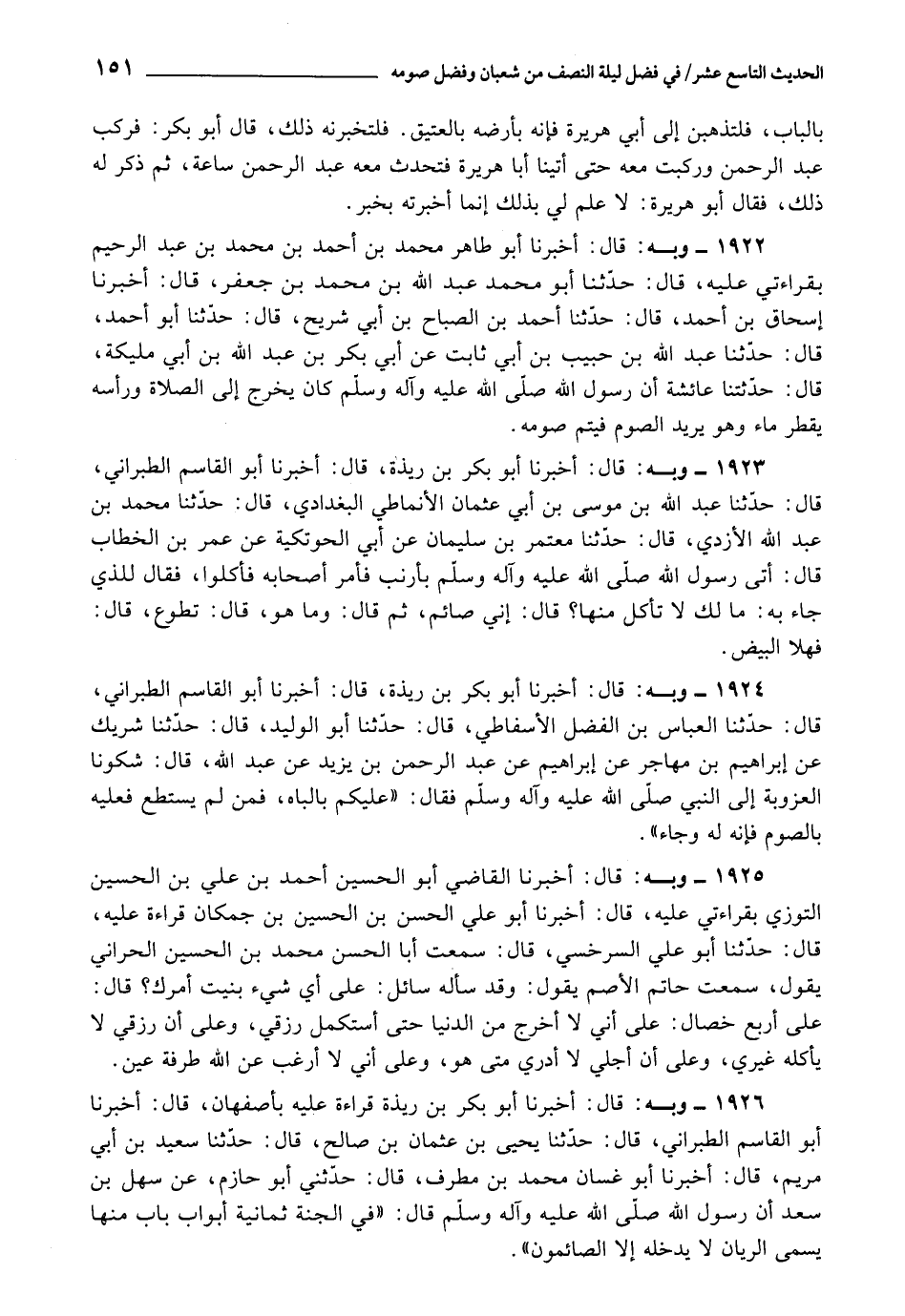 1926 - أَخْبَرَنَا أَبُو بَكْرِ بْنُ رَيْذَةَ قِرَاءَةً عَلَيْهِ بِأَصْفَهَانَ، قَالَ: أَخْبَرَنَا أَبُو الْقَاسِمِ الطَّبَرَانِيُّ، قَالَ: حَدَّثَنَا يَحْيَى بْنُ عُثْمَانَ بْنِ صَالِحٍ، قَالَ: حَدَّثَنَا سَعِيدُ بْنُ أَبِي مَرْيَمَ، قَالَ: أَخْبَرَنَا أَبُو غَسَّانَ مُحَمَّدُ بْنُ مُطَرِّفٍ، قَالَ: حَدَّثَنِي أَبُو حَازِمٍ، عَنْ سَهْلِ بْنِ سَعْدٍ , أَنّ رَسُولَ اللَّهِ صَلَّى اللَّهُ عَلَيْهِ وَآلِهِ وَسَلَّمَ، قَالَ: «فِي الْجَنَّةِ ثَمَانِيَةُ أَبْوَابٍ، بَابٌ مِنْهَا يُسَمَّى الرَّيَّانُ , لَا يَدْخُلُهُ إِلَّا الصَّائِمُونَ»