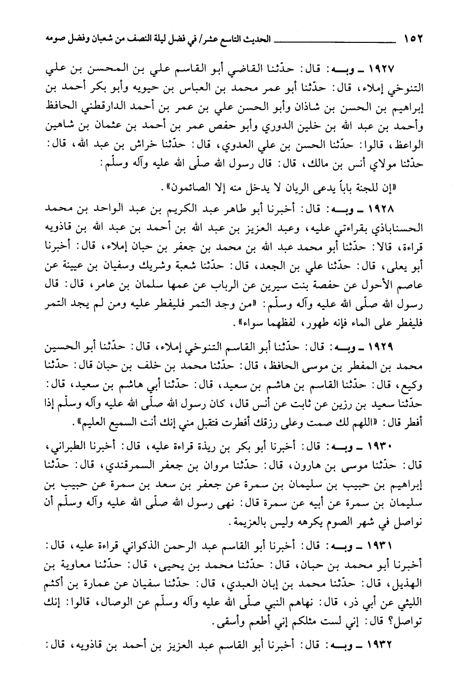 1927 - حَدَّثَنَا الْقَاضِي أَبُو الْقَاسِمِ عَلِيُّ بْنُ الْمُحَسِّنِ بْنِ عَلِيٍّ التَّنُوخِيُّ، إمْلَاءً، قَالَ: حَدَّثَنَا أَبُو عُمَرَ مُحَمَّدُ بْنُ الْعَبَّاسِ بْنِ حَيُّوَيْهِ، وَأَبُو بَكْرٍ أَحْمَدُ بْنُ إِبْرَاهِيمَ بْنِ الْحَسَنِ بْنِ شَاذَانَ، وَأَبُو الْحَسَنِ عَلِيُّ بْنُ عُمَرَ بْنِ أَحْمَدَ الدَّارَقُطْنِيُّ الْحَافِظُ , وَأَحْمَدُ بْنُ عَبْدِ اللَّهِ بْنِ خِلِّينَ الدُّورِيُّ , وَأَبُو حَفْصٍ عُمَرُ بْنُ أَحْمَدَ بْنِ عُثْمَانَ بْنِ شَاهِينٍ الْوَاعِظُ، قَالُوا: حَدَّثَنَا الْحَسَنُ بْنُ عَلِيٍّ الْعَدَوِيُّ، قَالَ: حَدَّثَنَا خِرَاشُ بْنُ عَبْدِ اللَّهِ، قَالَ: حَدَّثَنَا مَوْلَايَ أَنَسُ بْنُ مَالِكٍ، قَالَ رَسُولُ اللَّهِ صَلَّى اللَّهُ عَلَيْهِ وَآلِهِ وَسَلَّمَ: «إِنَّ لِلْجَنَّةِ بَابًا يُدْعَى الرَّيَّانَ , لَا يَدْخُلُ مِنْهُ , إِلَّا الصَّائِمُونَ»